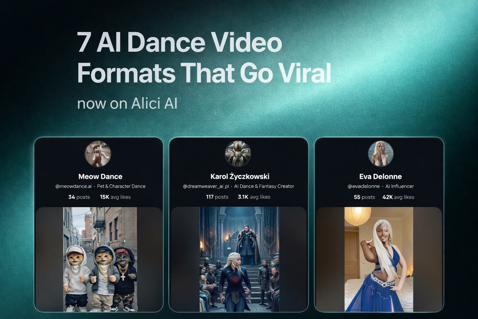 Quick Answer: The 7 AI dance video formats with the highest proven engagement are: (1) Animal/Mascot Dance (427K avg likes), (2) Cultural Remix (123K peak), (3) Trending Sound Ride (millions in aggregate), (4) "Is This AI?" Reveal (highest comment rate), (5) Celebrity Homage (7x engagement multiplier), (6) Contradiction Dance (highest share rate), and (7) Tutorial Split-Screen (highest save rate). Each format below includes a prompt you can copy, the tool setup on Alici AI, and the real engagement numbers behind it. If you haven't made your first AI dance video yet, start with my step-by-step tutorial first, then come back here for format ideas.