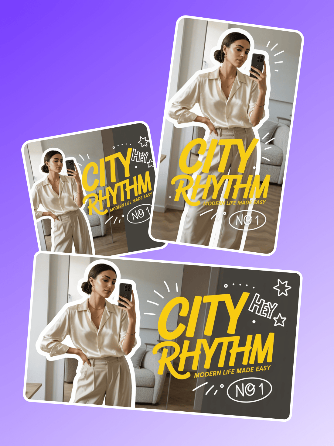 The demo above shows the same photo at three different output sizes, each with the "CITY RHYTHM No.1" text overlay fully intact. A traditional resize tool would either shrink the text into illegibility or slice it off at the crop boundary. Content-aware AI treats text regions and key subjects as high-priority zones, scaling them independently from the background so lettering stays readable regardless of the target aspect ratio.