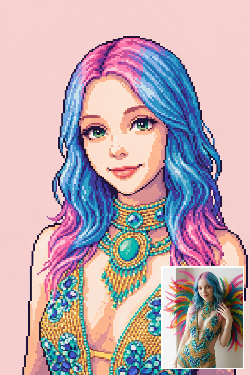 If your upload has pink, blue, green or any saturated hair color, keep the last line of the prompt intact. It explicitly tells the model to preserve the hair color exactly instead of neutralizing it, which is what most generic pixel generators do by default. This is how the demo hero keeps the bluewash from the original photo.