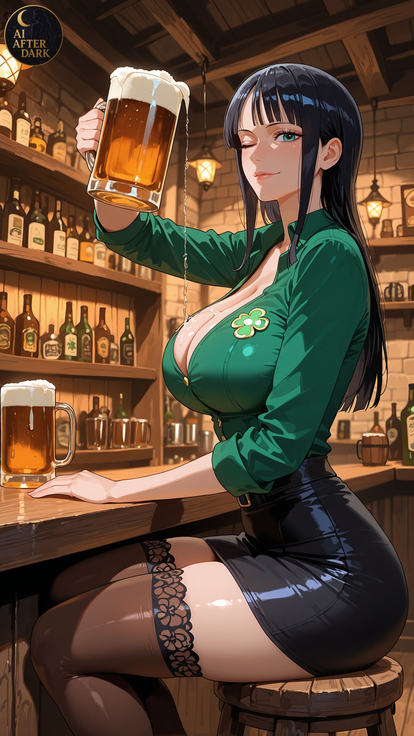 This image has the structure of a fantasy tavern performance poster. The character is posed like she has just turned toward the audience mid-dance, and the dress lift, confetti, and laughing background patrons all support that sense of motion and public spectacle. The color design is especially effective: violet hair and emerald dress stand out against the warm wooden hall and hanging lanterns, giving the scene a strong nightlife atmosphere without needing a dark palette. It feels less like an adventure scene and more like a celebratory character spotlight inside a lively role-playing-game tavern.