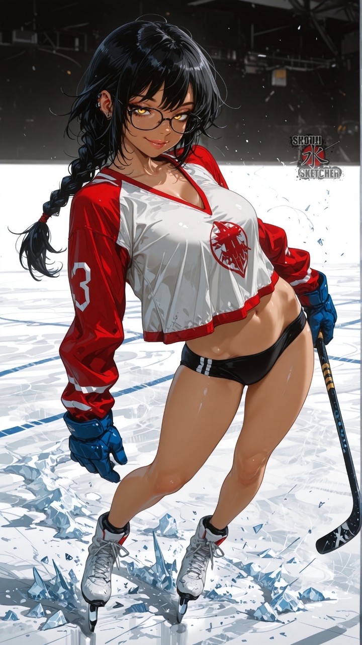 This image works by fusing athletic equipment, anime glamour, and graphic poster composition into one instantly readable character piece. At first glance it is about a woman on skates holding a hockey stick, but the success of the image comes from how the artist stylizes every element, the pose, the wardrobe, the ice, and the background circle, into one cohesive fantasy of sporty confidence.