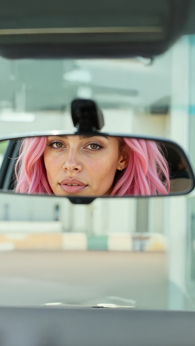 The rear-view mirror functions as a natural frame-within-frame. It adds structure, depth, and narrative context in one object. Because the composition is so stripped down, every detail matters: hair color, eye state, lip line, and mirror placement.