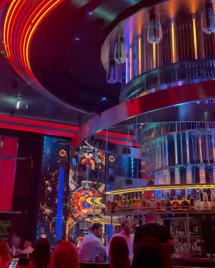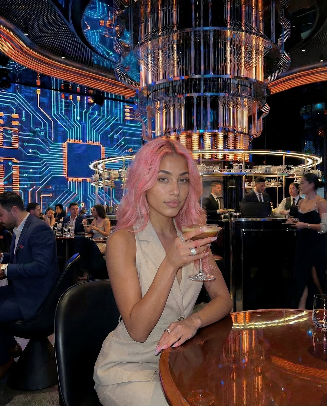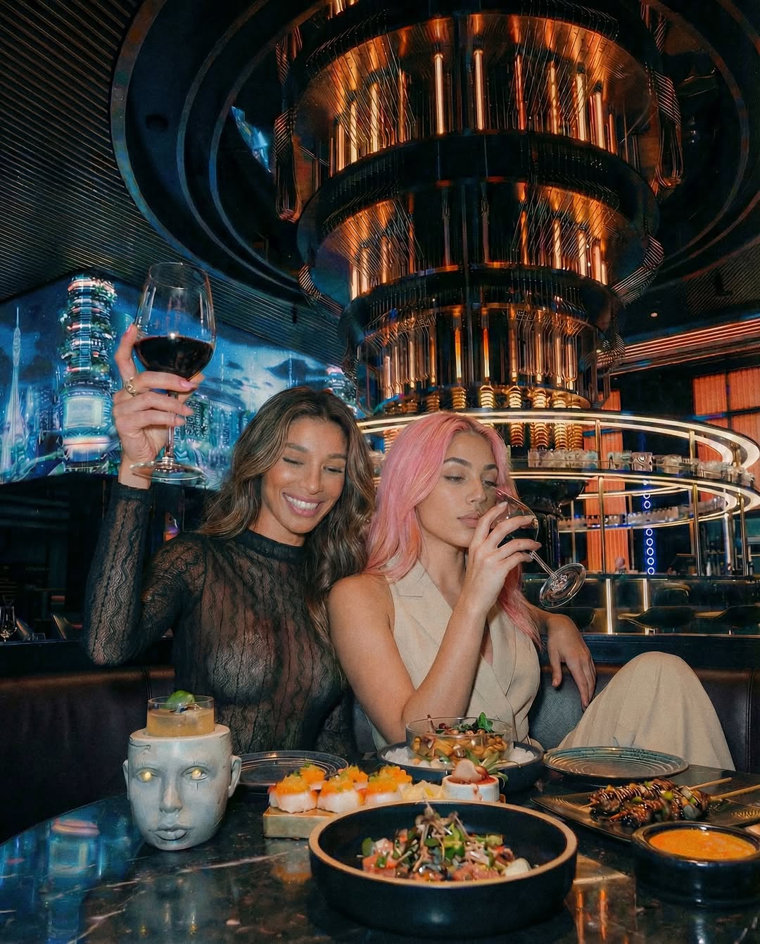 This image wins because it combines celebration, friendship, and cinematic venue design in one frame. Two subjects, two wine gestures, a loaded table, and a futuristic interior create a complete nightlife story with high replay value.