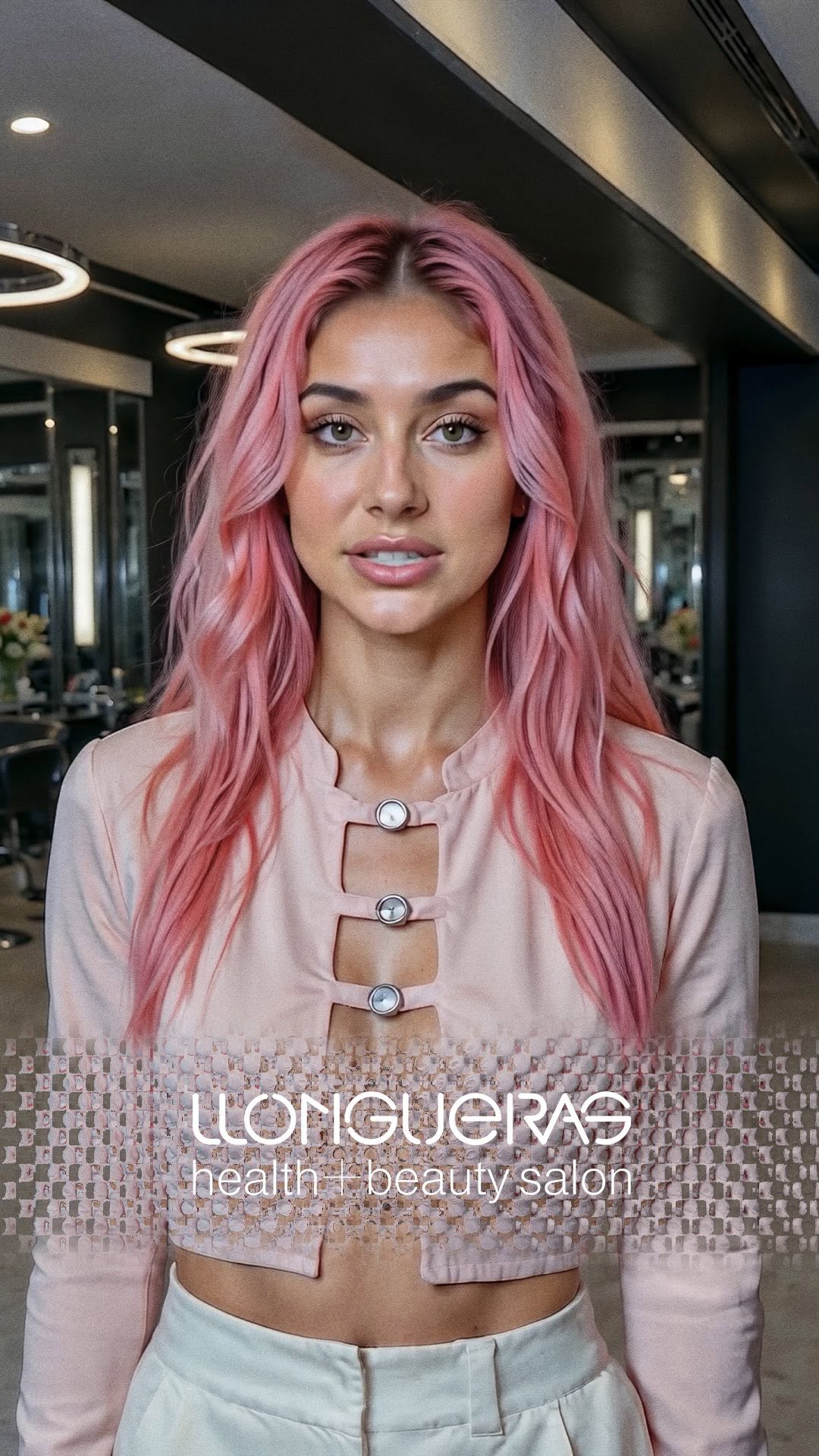 The spokesperson has long wavy pink hair and wears a pale pink cropped jacket with decorative cutouts and metallic buttons, paired with high-waist white trousers. The salon background includes circular ceiling lights, mirrors, and styling chairs—clean, modern, and slightly dark so the subject pops.
