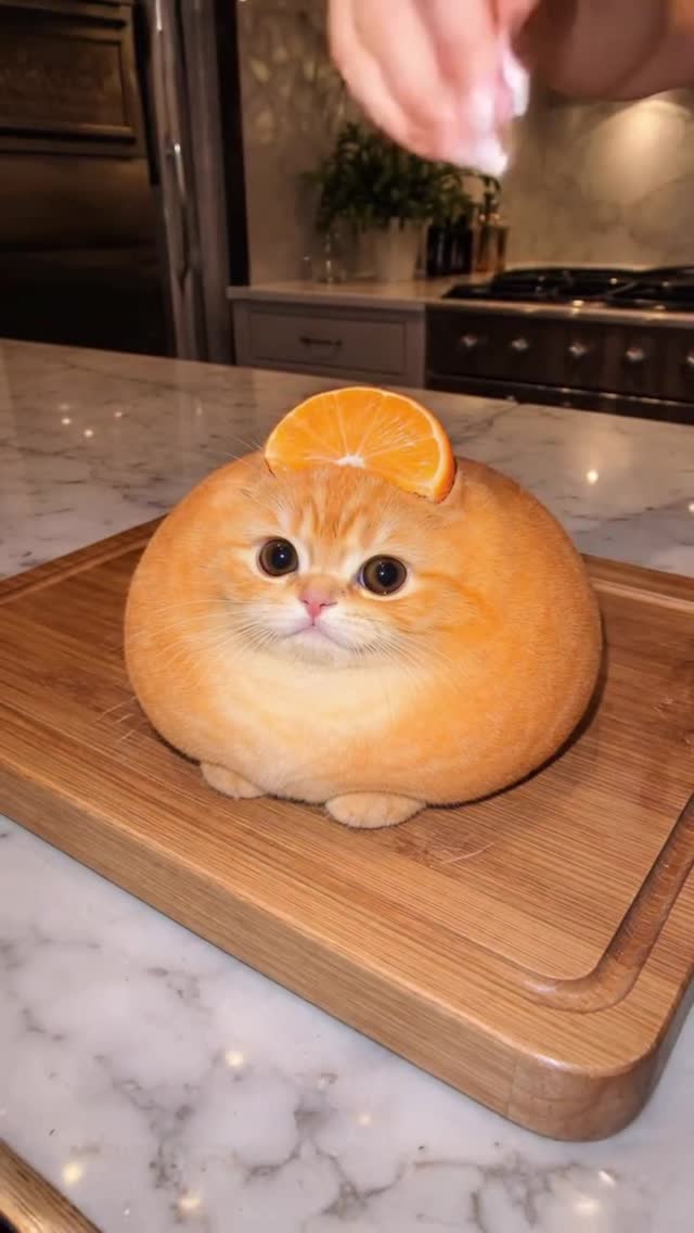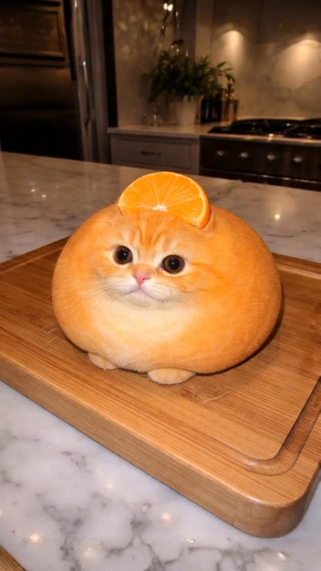 | 00:00–00:02 | Round orange cat on cutting board with orange slice garnish | Centered close shot, handheld phone micro-shake | Warm kitchen light | Instant hook |