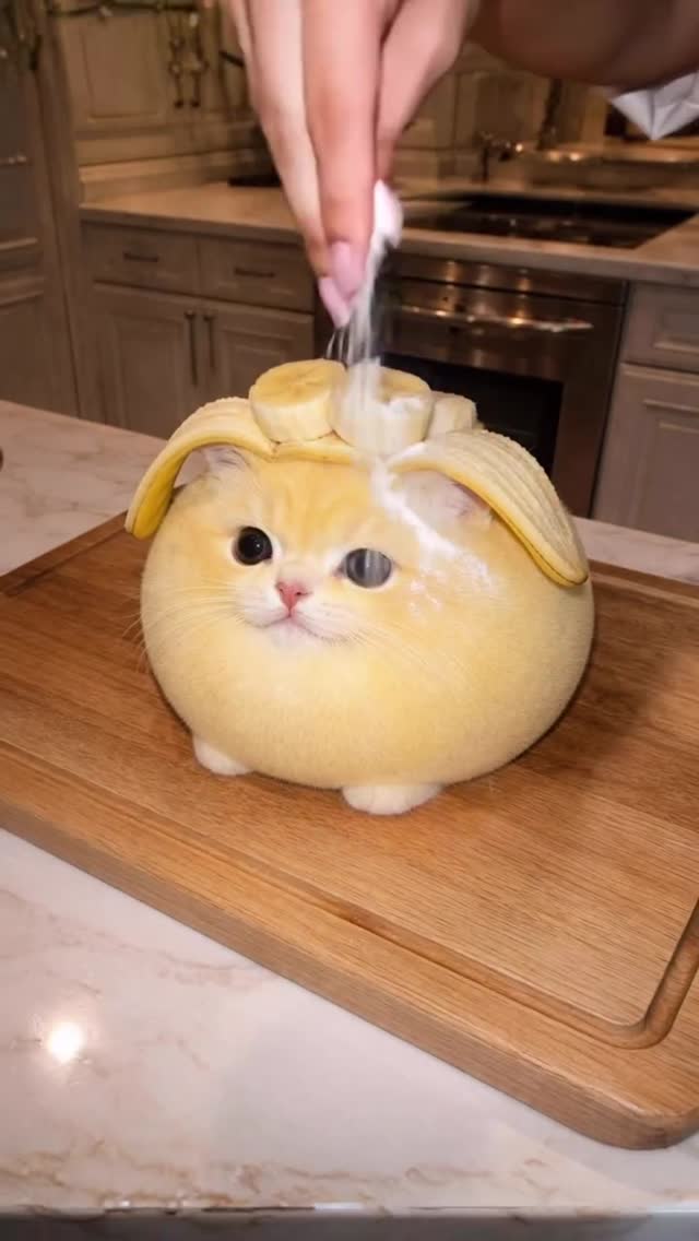 | 00:00 – 00:03 | A hand sprinkles white powdered sugar over the Banana Mochi Cat. | Static Close-up | Warm, high-key kitchen lighting. | The "Hook": Visual ASMR and curiosity about the creature. |