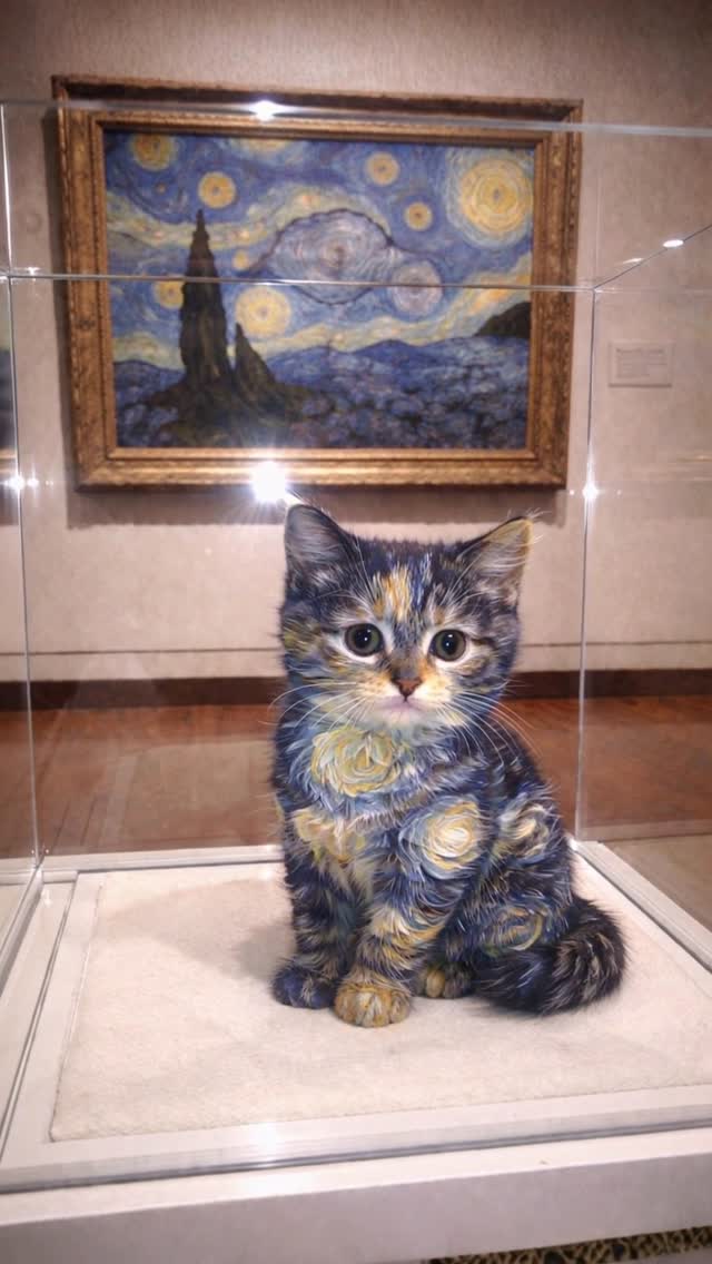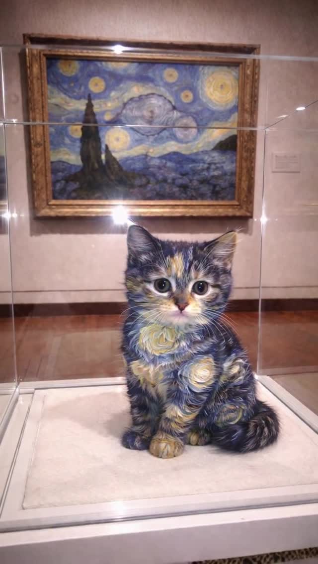This image combines two high-performing attention systems: familiar art history and universal cuteness. The brain recognizes the Starry Night visual language immediately, but then notices it has been transferred onto a kitten inside a museum-like display. That mismatch creates a strong pause moment.