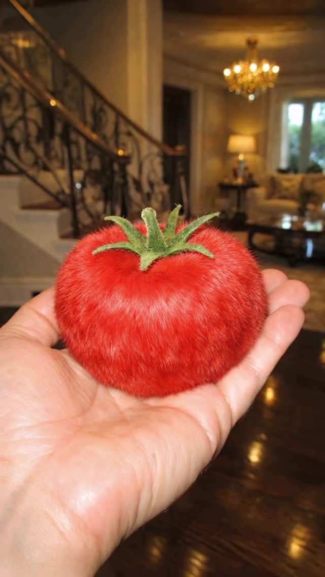 The tomato is instantly recognizable, but the surface is velvet/furry, which creates a split-second contradiction. That contradiction is the scroll-stopper: viewers pause because they need to confirm what they’re seeing.