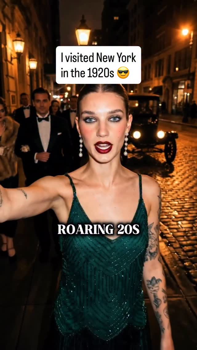 This short video is a historical roleplay selfie reel built around one sharp premise: a glamorous young woman behaves as if she is really walking through 1920s New York on the way to, and inside, a speakeasy. The clip mixes night-street atmosphere, direct-to-camera performance, and a crowded live-jazz interior.
