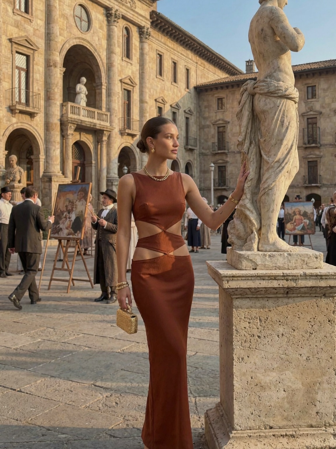 | Background diners in soft focus | “Roman diners in tunics/togas, softly blurred background” |