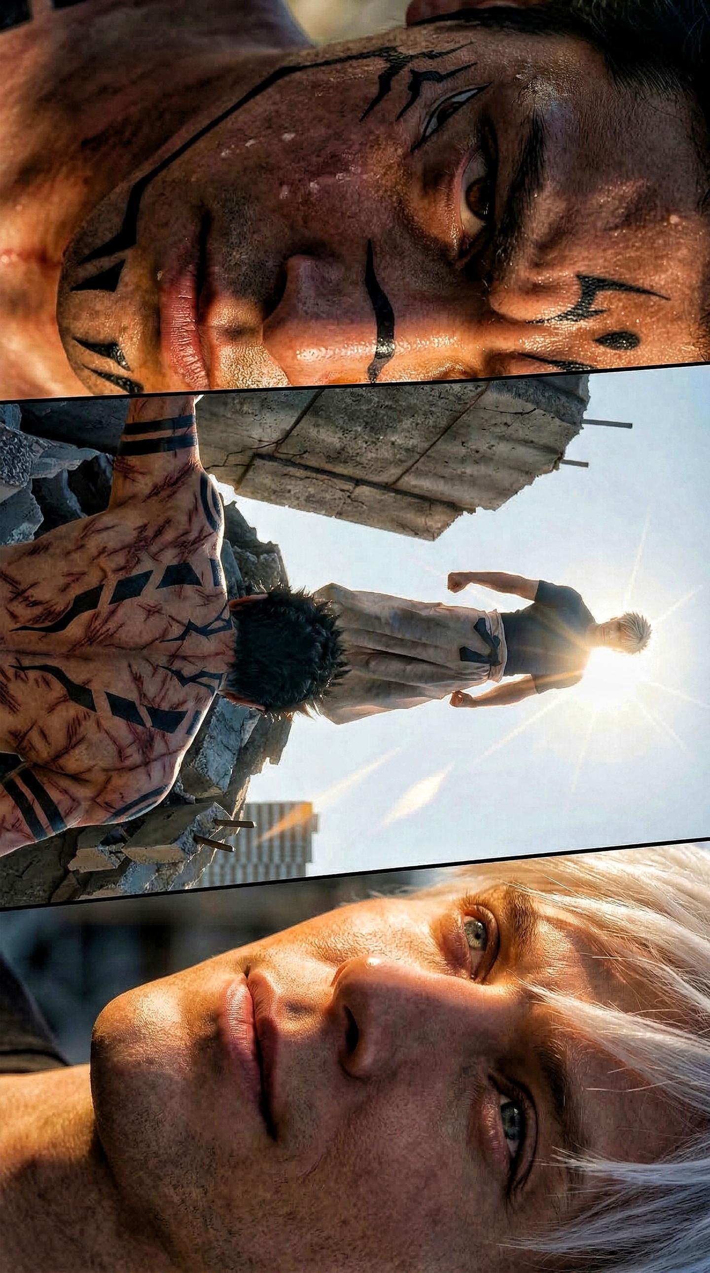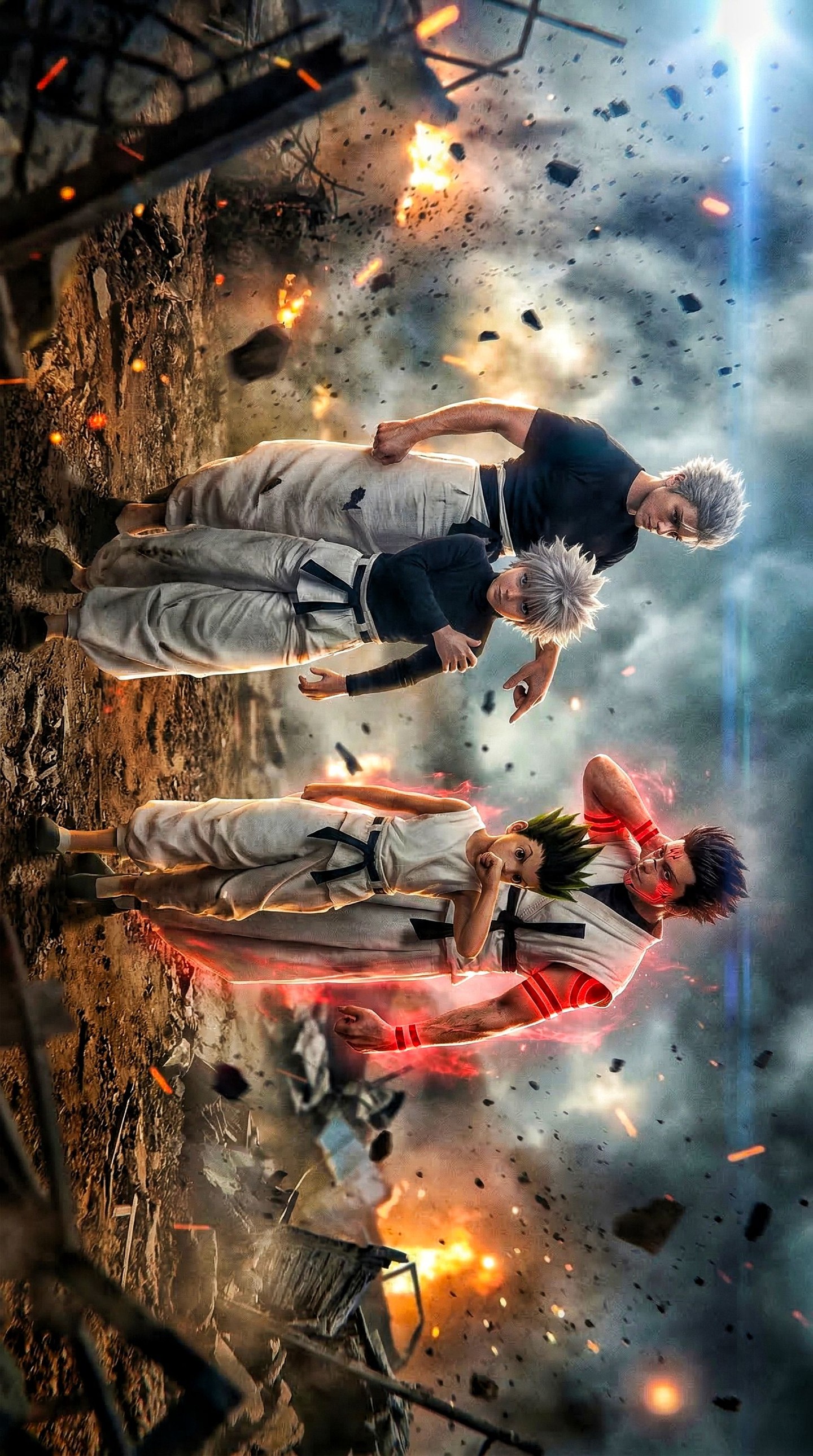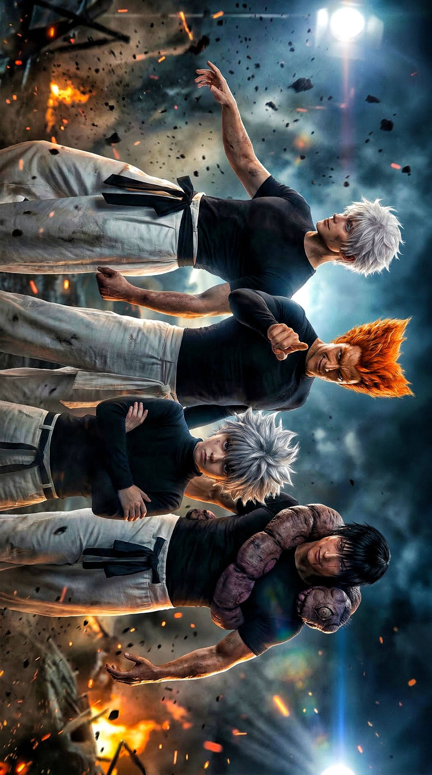 The aura in this image is not merely there to signal power. It plays a structural role. Against a smoky battlefield, characters can easily disappear into the environment, especially when both costume and background are dark. The electric-blue aura solves that problem by separating the body from the surrounding destruction. It sharpens the silhouette, frames the pose, and introduces a supernatural identity at the same time.