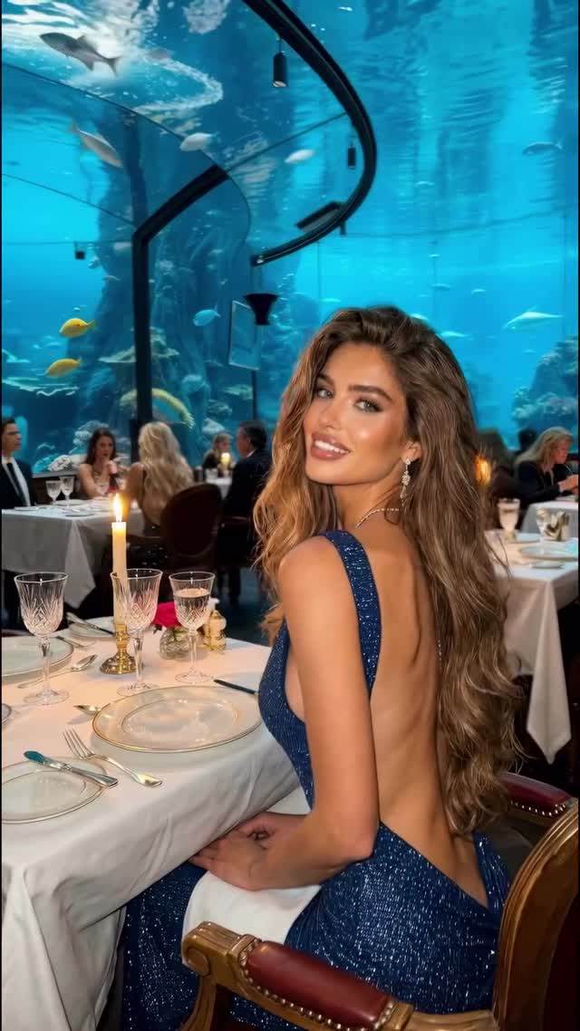 This post works because it merges two visual fantasies into one coherent shot: high-end dining and underwater spectacle. Most lifestyle images choose either fashion or location. This one keeps both, but with clear hierarchy. The subject remains the emotional center, while the aquarium functions as environmental drama. That balance is exactly why viewers pause instead of scrolling.