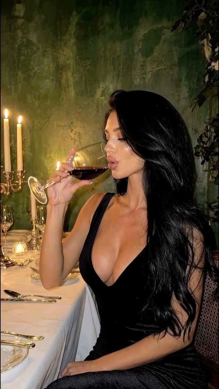 This frame goes viral because it combines status signaling and emotional intimacy in one shot. The tableware and wine set the luxury context, but the candle foreground keeps the scene warm and sensory rather than distant. Viewers do not just see “expensive.” They feel a specific evening atmosphere.