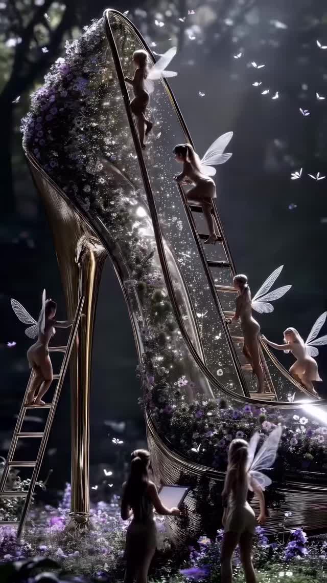 This image wins because it compresses contrast into one frame: a familiar luxury symbol (the glass heel) is turned into a tiny world with active characters, and that scale reversal creates instant curiosity before the viewer even reads the caption. You do not need context to understand the tension: small fairies are climbing, carrying, and arranging inside a giant reflective object. That single contrast gives the post a clean stop-scroll trigger.