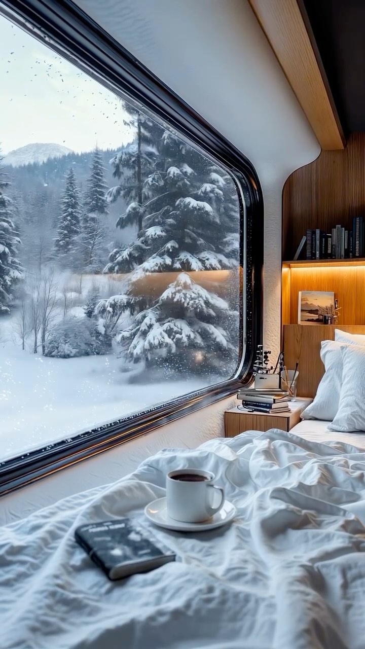 This image sells a fantasy that’s incredibly shareable: you’re warm in bed, coffee in hand, while the world outside turns into a snow globe. It’s not about Norway specifically—it’s about the contrast of comfort vs wilderness.