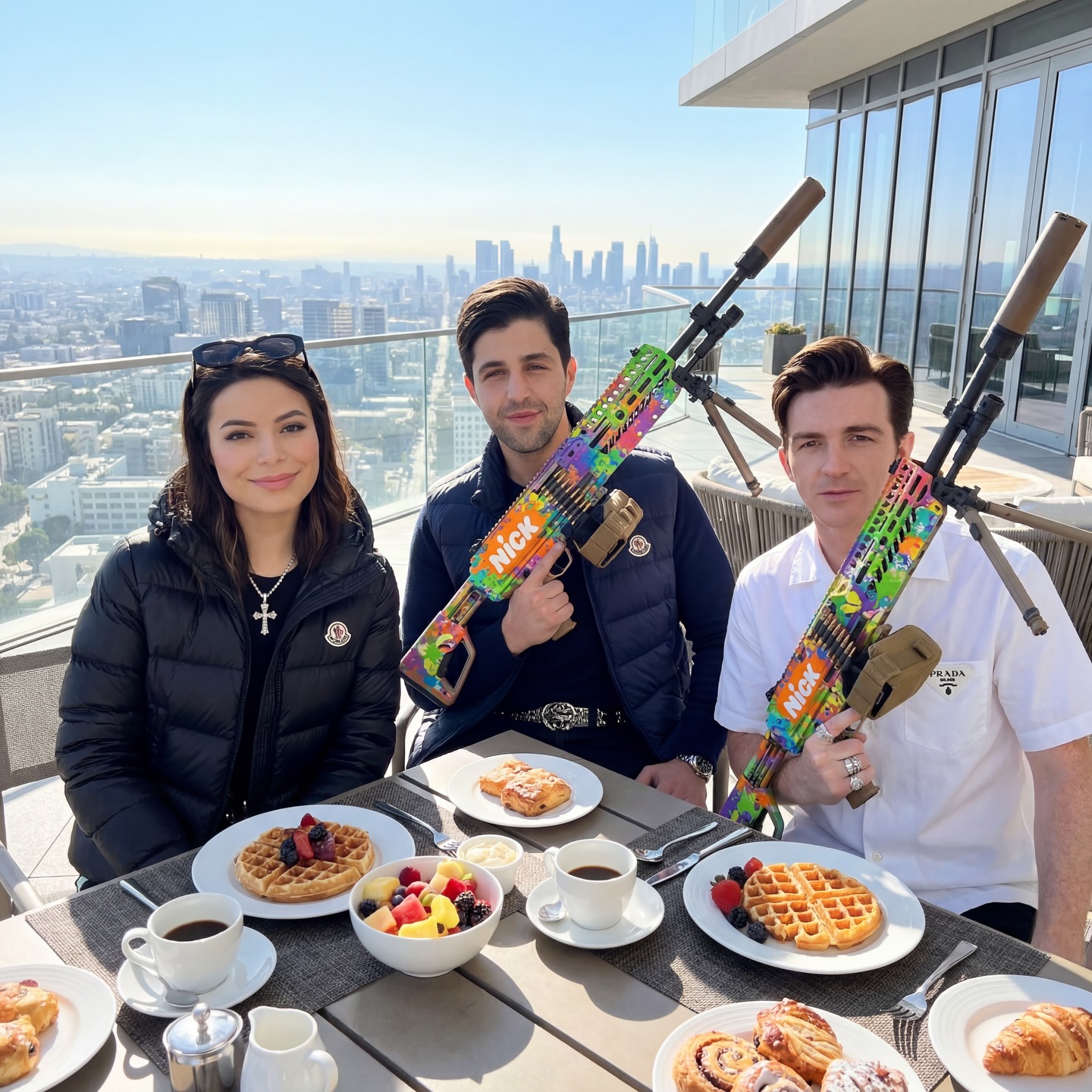 This image works because it never chooses between lifestyle photography and absurd satire. It insists on being both. On one level, everything reads like a standard rooftop brunch photo: pastries, coffee, skyline, expensive terrace, relaxed faces, clean daylight. On another level, two brightly painted rifles cut through the scene so hard that the whole image becomes an exercise in social contradiction. That collision is what makes the photo stick.