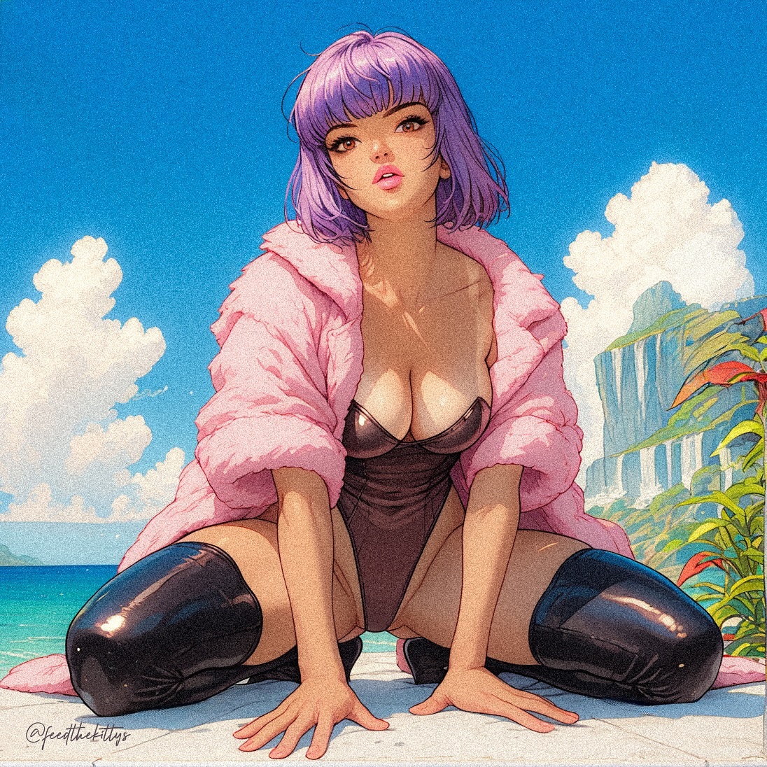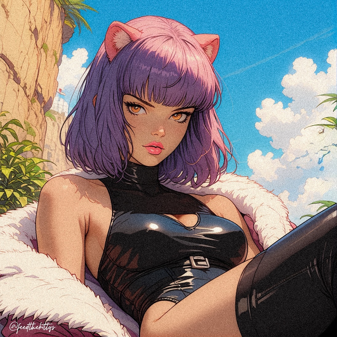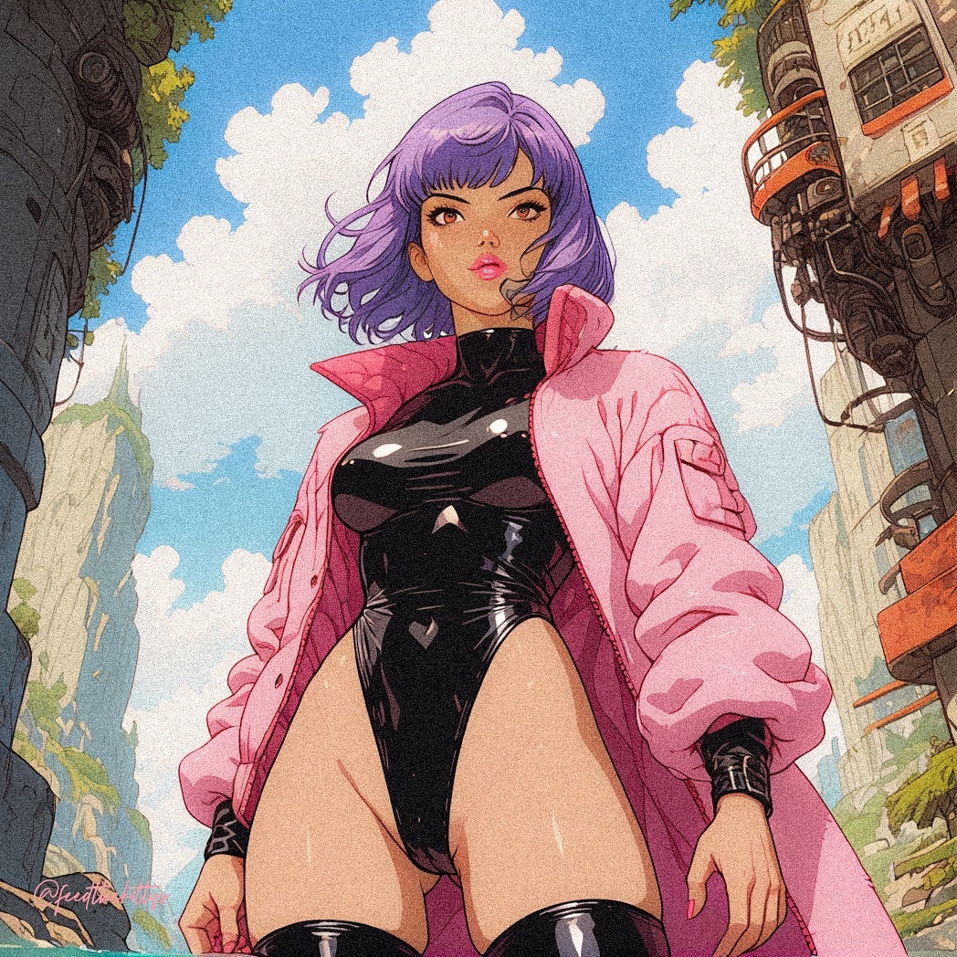 This image works because it takes a familiar cyber-fashion formula and brightens it instead of darkening it. You still get the glossy black bodysuit and the low-angle attitude, but the palette moves toward lavender, plush pink, and open blue sky. That shift matters. It makes the image feel more playful, collectible, and feed-friendly than the usual night-city cyberpunk look.