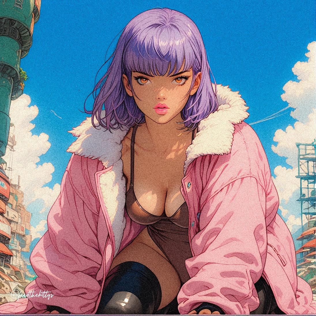 - Keep: one soft garment against one sleek garment. Change: pink to peach or lilac, and retro city to cleaner sci-fi district. Slot template: "{soft outer color} {background style} {pose attitude} {daylight futurism}"