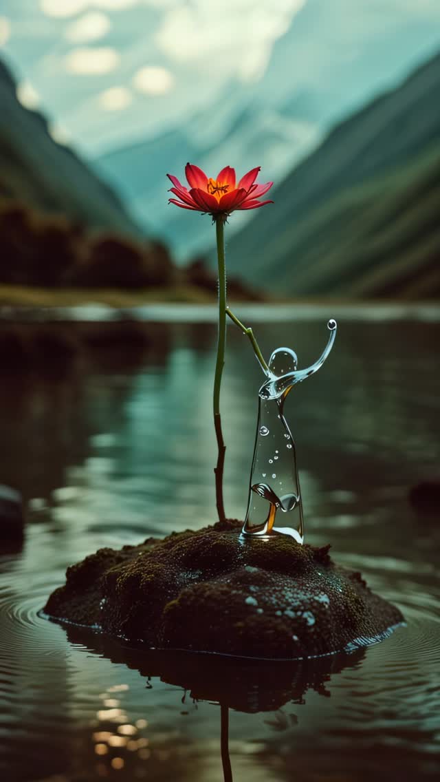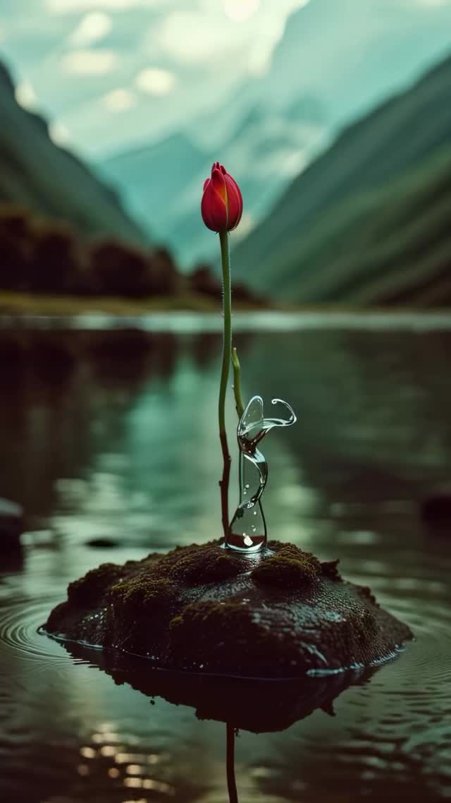 This viral masterpiece by @gerdegotit is a masterclass in surreal cinematic nature. It features a single, vibrant red flower—initially a bud that blooms into a full blossom—emerging from a mossy rock in the center of a serene mountain lake. The "hook" that stops the scroll is a physics-defying liquid humanoid figure, seemingly made of pure, translucent water, performing intricate acrobatic maneuvers around the flower's stem. The aesthetic blends the high-end look of a luxury perfume commercial with the hypnotic quality of digital ASMR. Key elements include the iPhone-realistic depth of field, the warm-to-cool color contrast (red flower vs. blue mountains), and the fluid, organic motion of the water-spirit. It’s a perfect example of "Visual Poetry" that transcends language barriers, making it globally shareable.