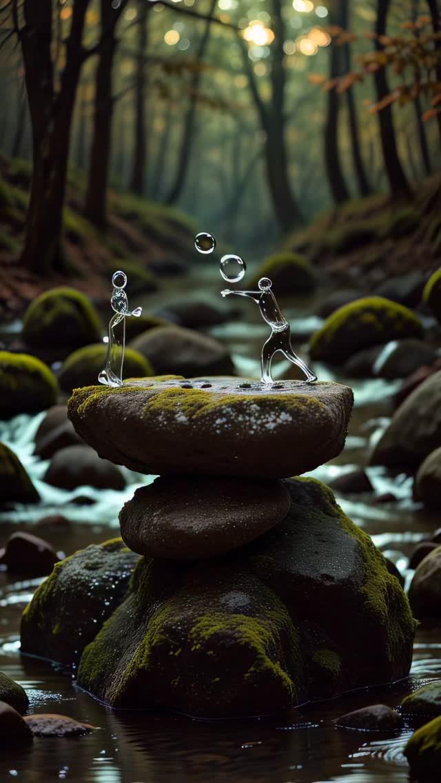 {natural_environment} {tiny_glass_figures} {center_pedestal_rock} {micro_motion_element}{cold_stream_scene} {miniature_translucent_characters} {soft_atmospheric_light}{night_forest_creek} {tiny_figurine_duo} {bioluminescent_particles} {cinematic_macro}The frame feels premium because it is restrained. Colors stay natural, contrast is controlled, and the surreal element is introduced quietly rather than explosively. This restraint makes the image poetic instead of gimmicky.