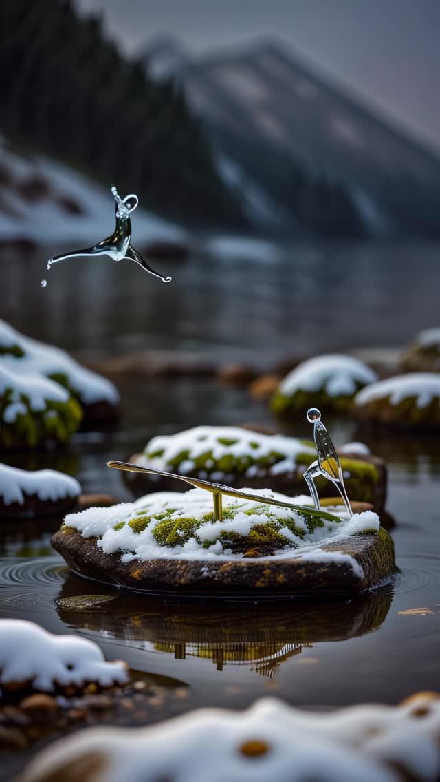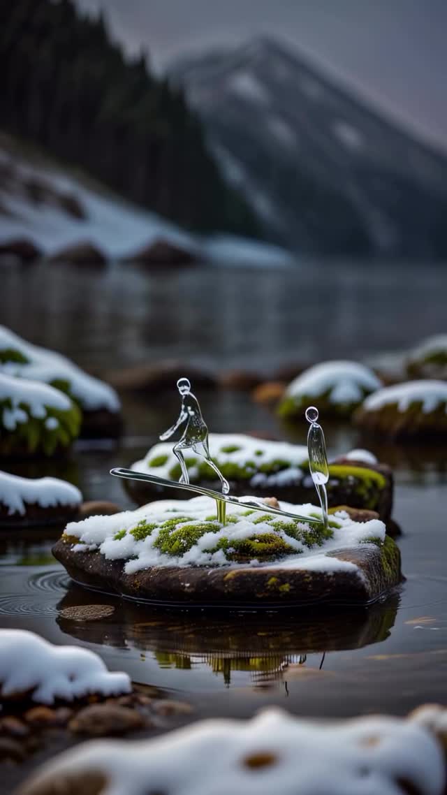 This page breaks down a “tiny world” format that performs because it’s oddly satisfying, visually clean, and loop-friendly: two transparent droplet humanoids playing with a twig seesaw on a snow-and-moss rock in a winter lake.