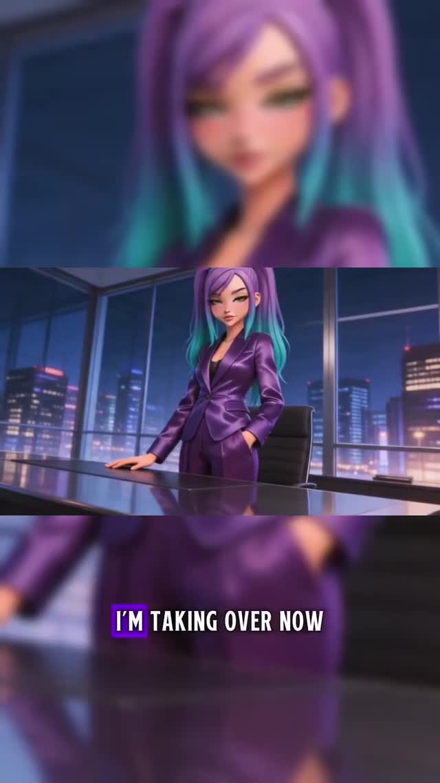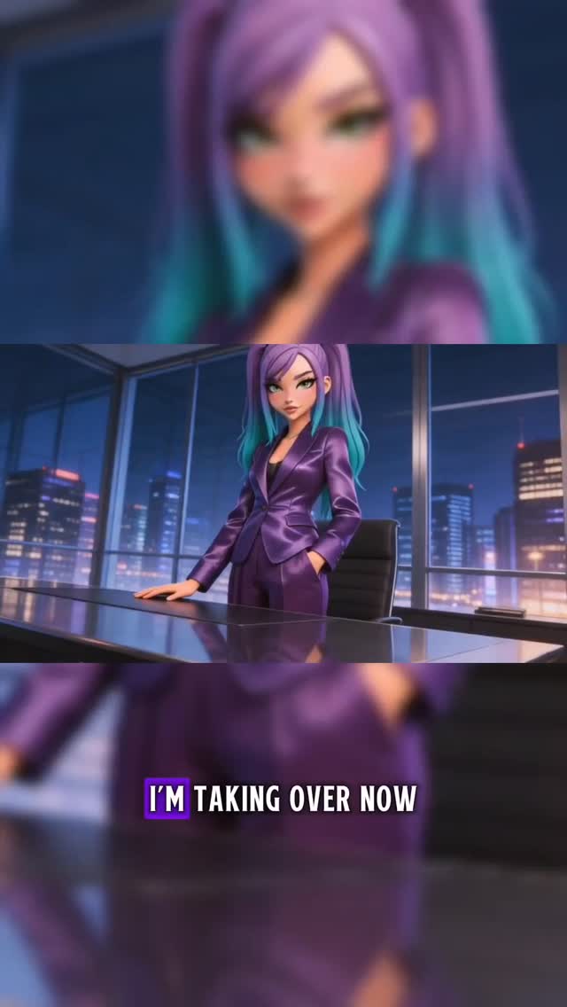 This reel takes a familiar music-video confidence hook and translates it into a glossy anime-office power fantasy. The visual pitch is immediate: a purple-and-teal-haired heroine in a satin-like purple suit dominates a stylish executive office while lyric subtitles reinforce control, status, and heat. The concept feels like part corporate anime, part AI music visual, part boss-girl character branding. That hybrid is exactly why the reel works. It does not look like a random anime clip. It looks like a stylized identity system built around a repeatable archetype: the woman who is in charge, knows it, and performs it with style.
