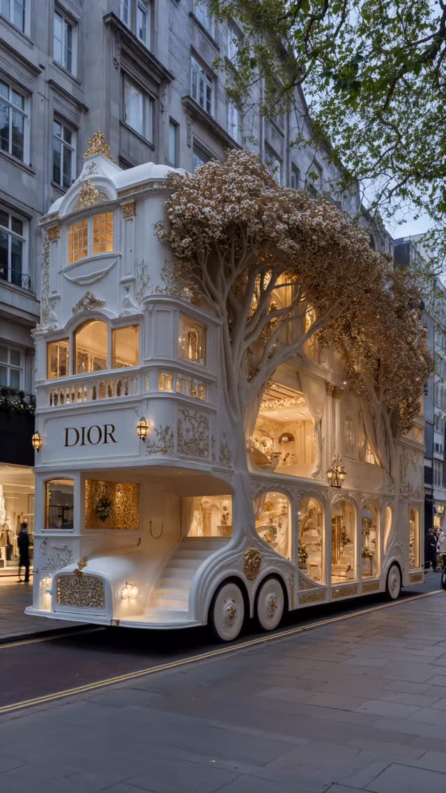 This image works because it combines two worlds that rarely meet in one clean frame: luxury retail architecture and street mobility. At first glance you think you are looking at a boutique facade; one second later you realize it is a vehicle. That delayed recognition is the hook. The creator did not rely on chaos, fast motion, or text overlays. The post wins through a single high-concept visual contradiction delivered with polished lighting and believable material detail.