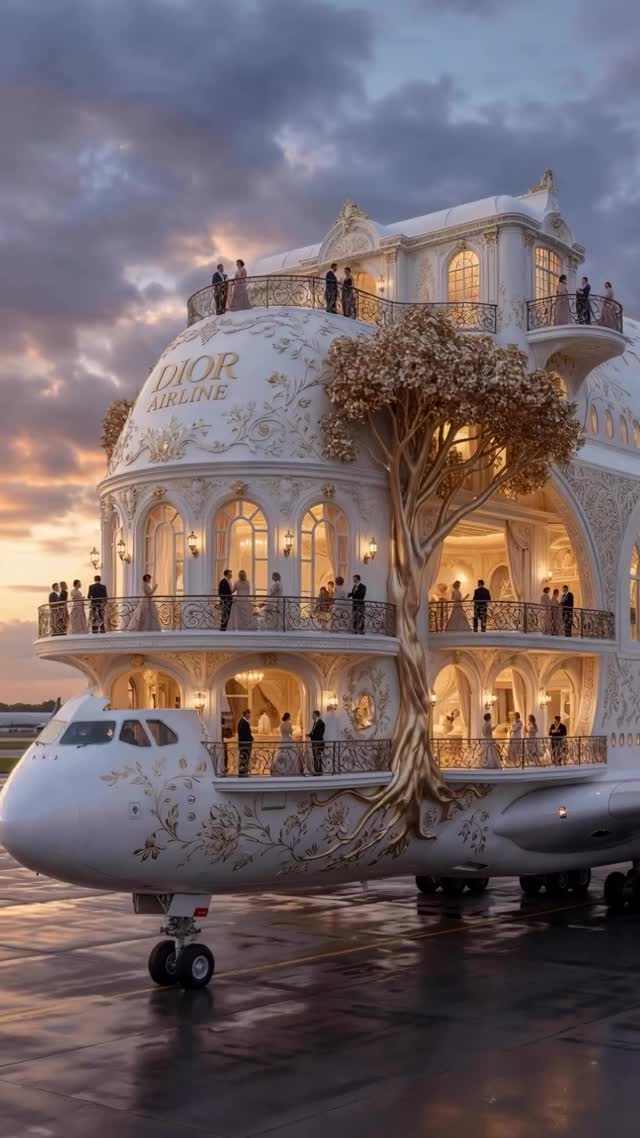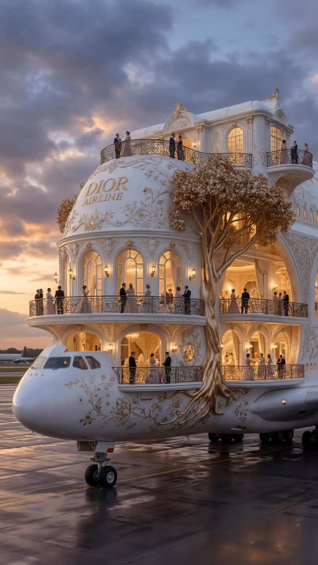 The hook is the contradiction: an aircraft (pure function) redesigned as architecture (pure ceremony). Your brain recognizes the plane instantly, then gets caught on the impossible details: multiple balcony levels, arched windows, warm interiors, and a literal tree grafted into the fuselage. That gap between “recognizable” and “impossible” is where curiosity lives.