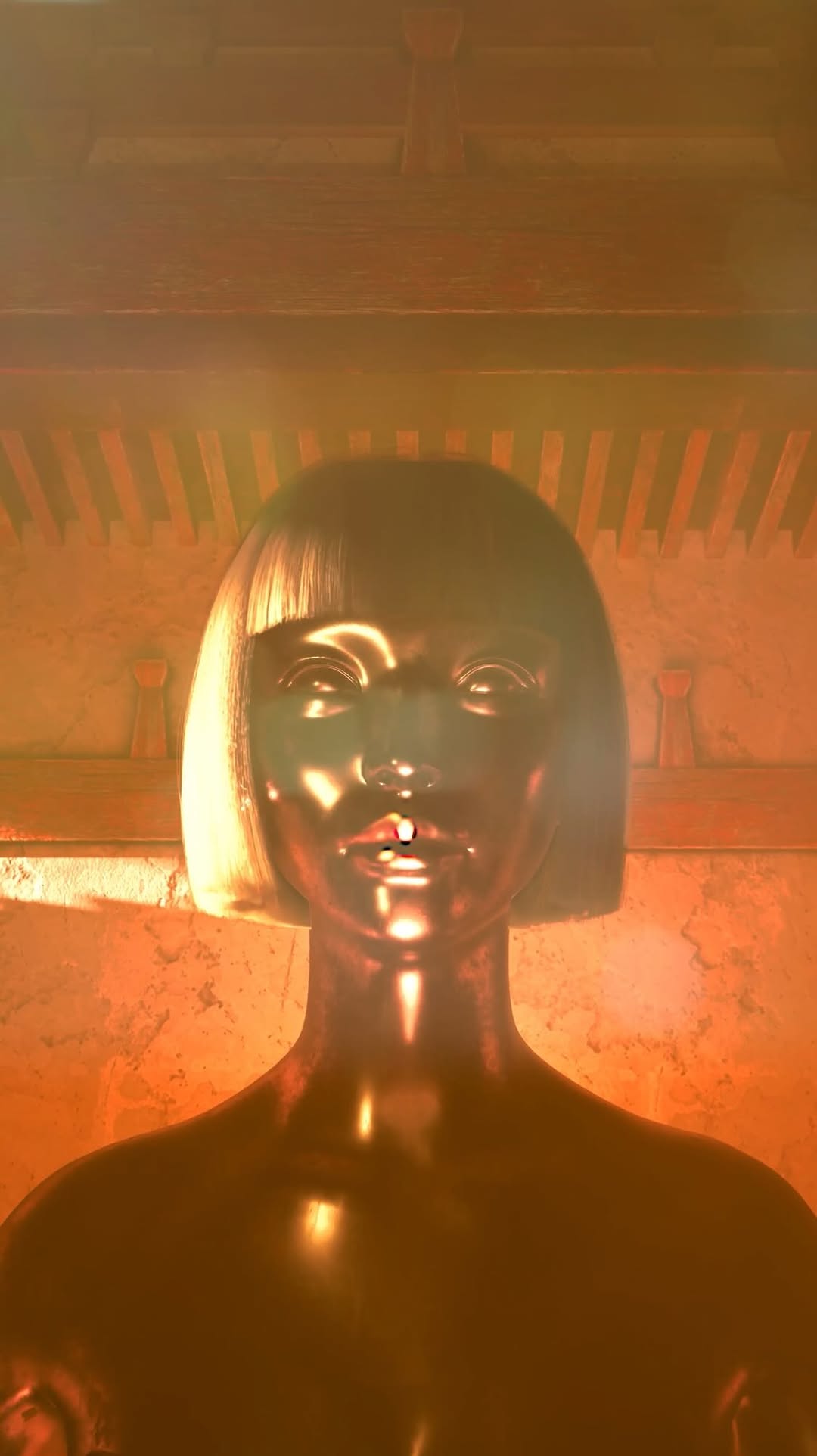 This image doesn’t celebrate with fireworks. It celebrates with finish: reflective metal skin, a clean bob cut, and a warm ceremonial glow that feels like a stage for reinvention. It’s a great New Year visual because it reads as transformation without needing literal symbols.