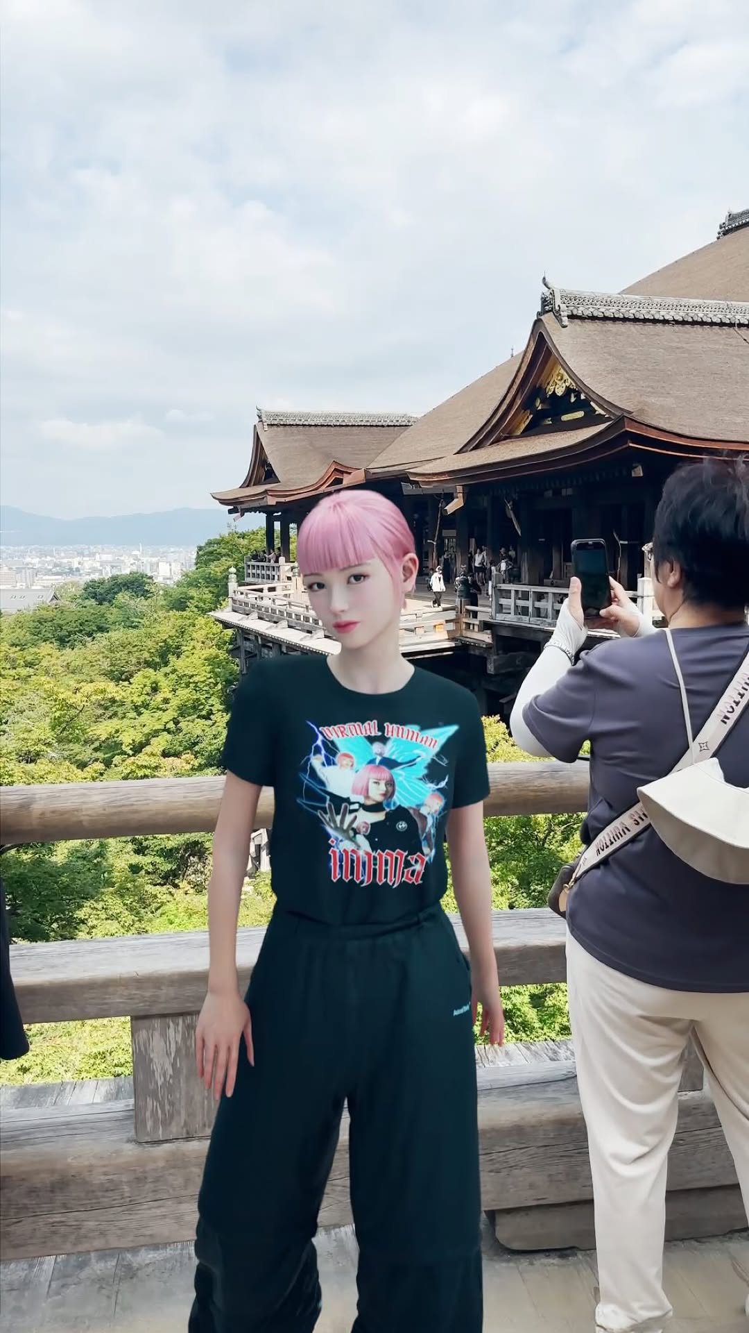 The fastest way to get attention in a travel feed is to show something recognizable. The temple terrace and forested hillside instantly signal “Kyoto” even if the viewer doesn’t know the exact spot. But recognition alone isn’t enough—everyone has seen a landmark photo. The twist is the avatar: a slightly game-like digital human, dressed in streetwear, placed small at the bottom like a character entering a level. That contrast (ancient place + digital visitor) creates curiosity without needing a complicated scene.