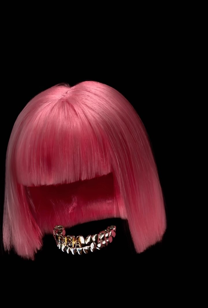 This image is basically an identity update without a face. Pink hair is the headline, the grill is the signature, and the black background is the silence that makes everything louder.
