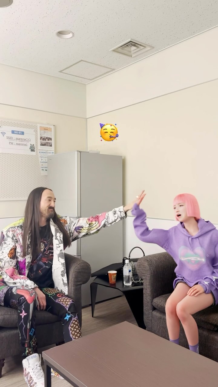This reel is a social-anxiety interview joke built around a simple premise: what if you finally got to interview Steve Aoki, but you were too nervous to behave normally? The entire piece is staged in a plain backstage room with Steve seated confidently on one side and the nervous interviewer on the other in a purple hoodie and pink bob. The humor comes from internal-thought captions like "was that a weird question", "how should i react", "when should i start talking", and "send help", plus a final gag where she visually disappears from the couch. Search-intent wise, the clip crosses awkward interview meme, POV social anxiety, celebrity interview comedy, Steve Aoki fan content, internal monologue reel, and disappearing embarrassment meme. It works because the setup is specific enough to feel real but broad enough to map onto anyone who has ever overthought a conversation in real time.