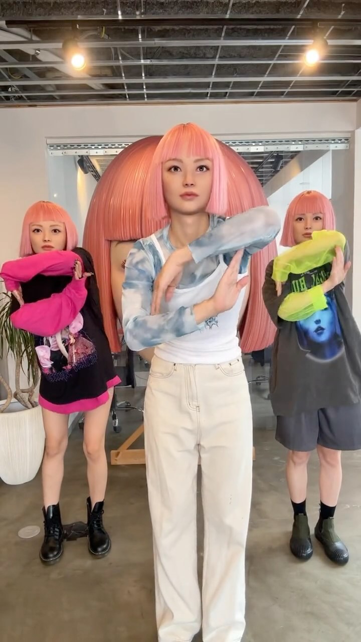 The setting helps as well. The plain studio-office interior with concrete floor and glass walls gives the surreal prop room to dominate the frame. Because the environment is neutral, the pink hair and matching styling become the main visual signature. That makes the whole clip feel like a controlled concept instead of a chaotic meme.