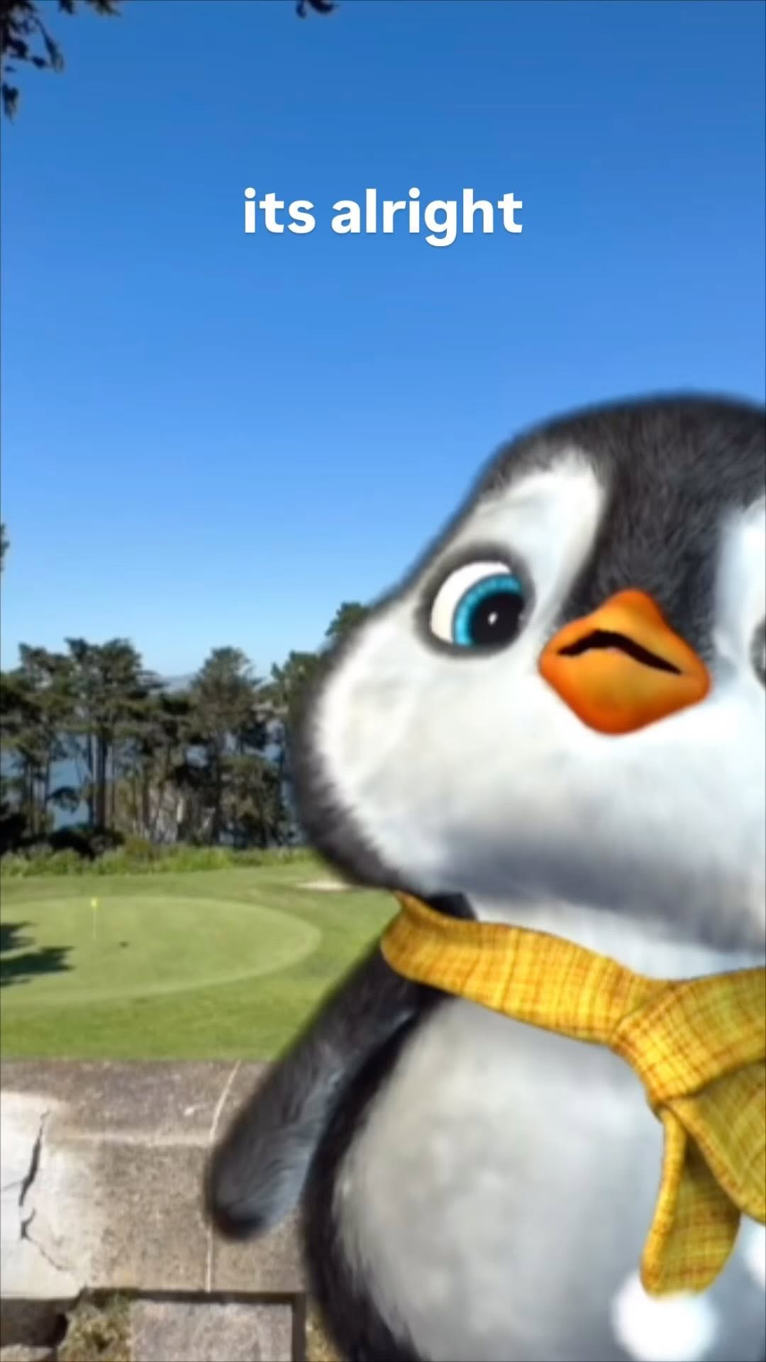 | 00:00 - 00:01 | Penguin looks slightly sad/pouty, text "its alright" appears. | Close-up (CU) | Bright, natural daylight; warm tones. | Hook: Immediate emotional connection through vulnerability. |