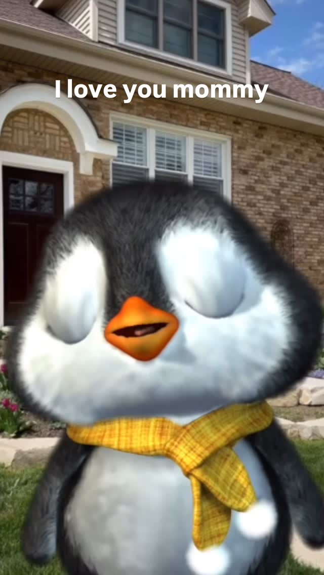 The aesthetic power is in emotional directness. The oversized penguin face is centered low enough to leave clear space for text, creating a strong top-to-bottom reading flow: message first, emotion second. The yellow scarf adds a warm accent that contrasts well with neutral bricks and sky tones. House architecture introduces believable domestic context without crowding the frame. Lighting remains soft and natural, which supports sincerity and keeps the image non-dramatic. The character’s open beak and bright eyes make the message feel spoken, not just written. For creators, this is a practical family-content formula: one lovable mascot, one direct sentence, one familiar home location.