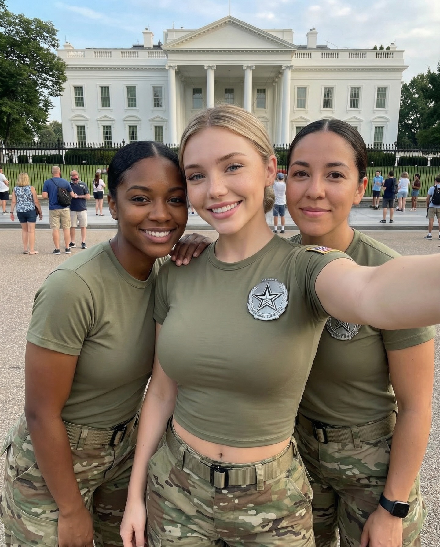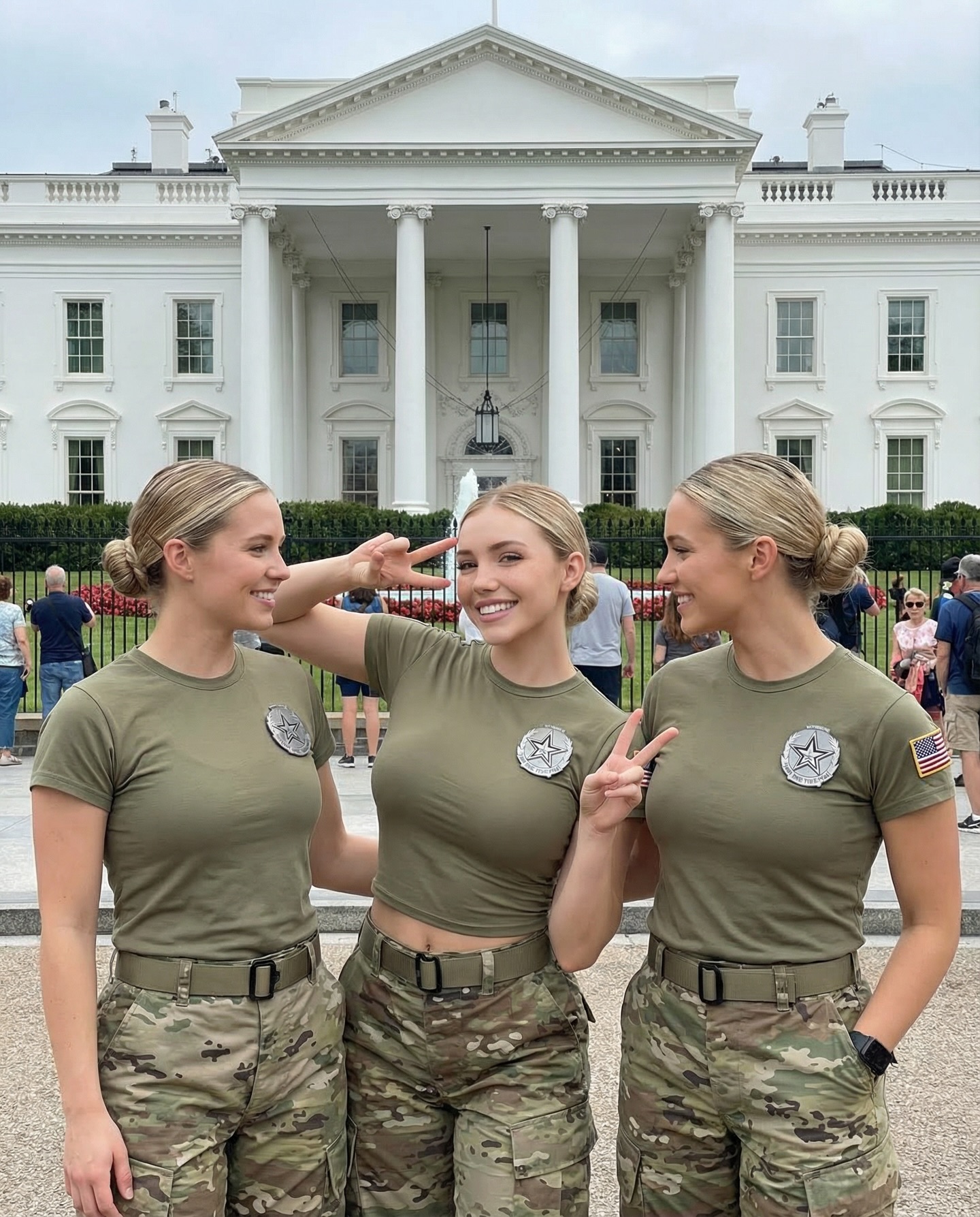 photorealistic vertical travel photo outside the White House, three women in matching olive t-shirts with U.S. flag sleeve patches and multicam camo pants, center woman smiling at camera, left and right women kissing her cheeks, peace sign gestures visible, black iron fence and tourists in background, White House centered and clearly recognizable, soft daylight, deep-ish focus, crisp candid snapshot