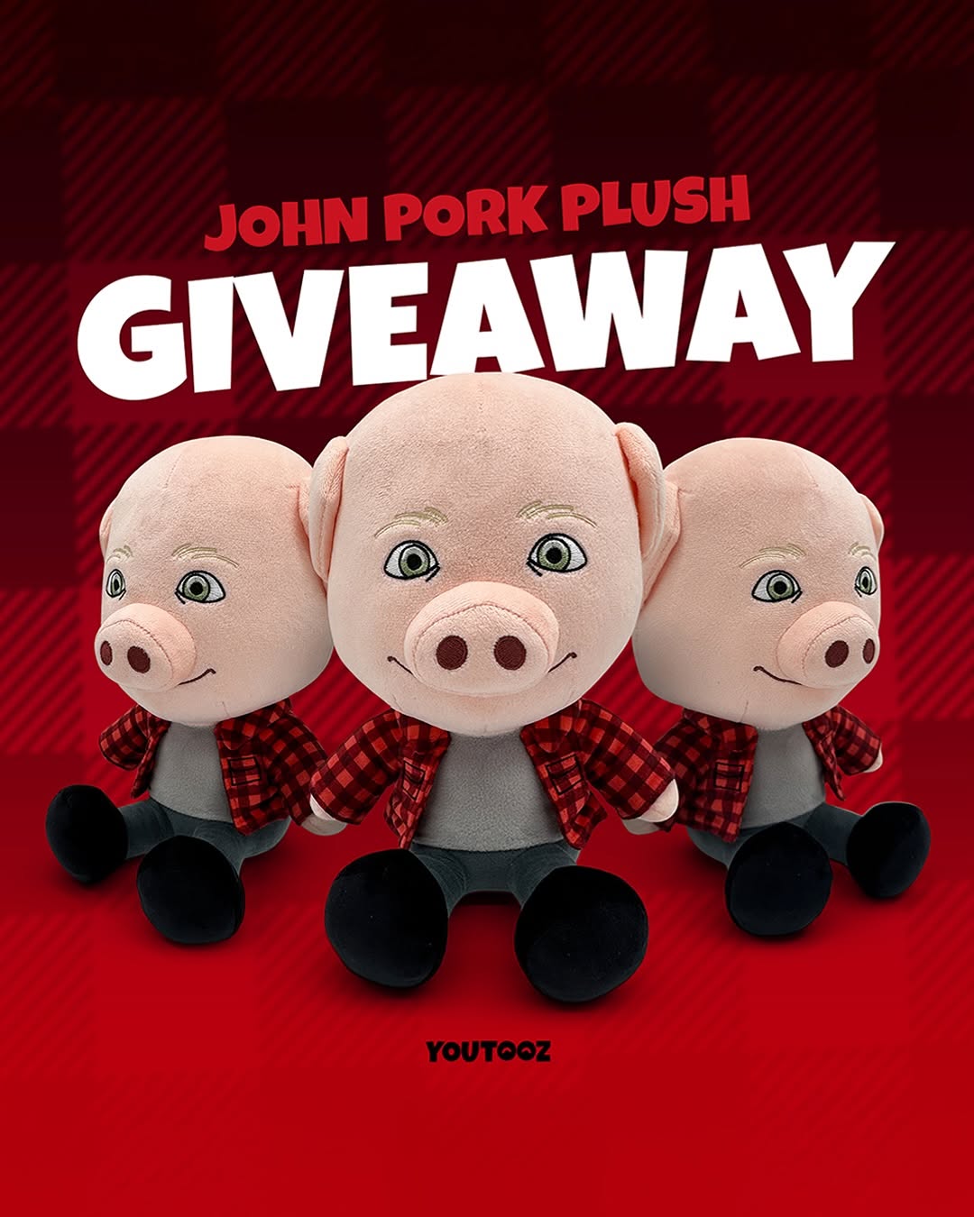 Create a square promotional poster for a plush toy giveaway. Use a deep red plaid-textured background with a clean gradient base. At the top, place bold all-caps text: first line "JOHN PORK PLUSH", second line "GIVEAWAY" in very large white heavy sans-serif. In the center, render three identical pig-character plush dolls wearing red-black plaid shirts, gray tops, dark pants, and black plush shoes. The center toy faces camera; left and right toys angle inward. Add soft grounding shadows. Keep a small brand wordmark at the bottom center. The style should be crisp, commercial, and social-ad ready.