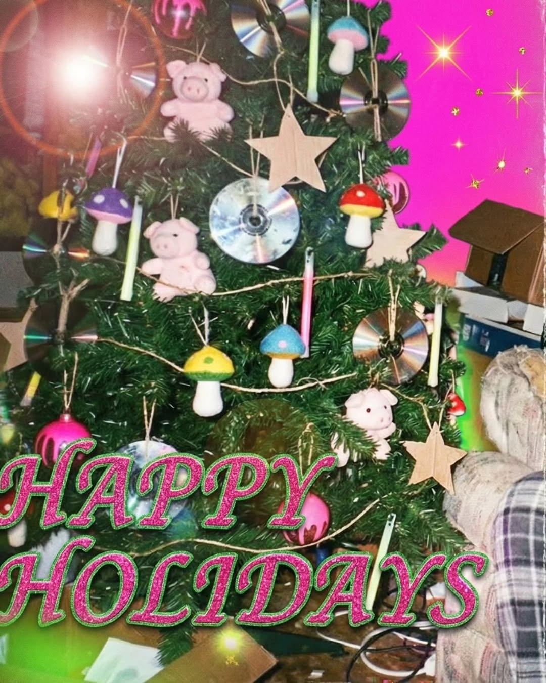 Oversized festive text, absurd face filter, and intentional tackiness create fast meme readability. It feels like internet culture, not polished advertising.