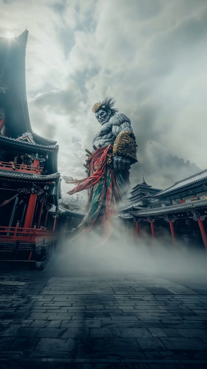 Scale is hard to sell in AI images because the scene needs measurable references. Here, the references are perfect: temple eaves, railings, and tiled roofs that everyone understands. When the giant rises above those familiar shapes, the brain believes the size immediately.