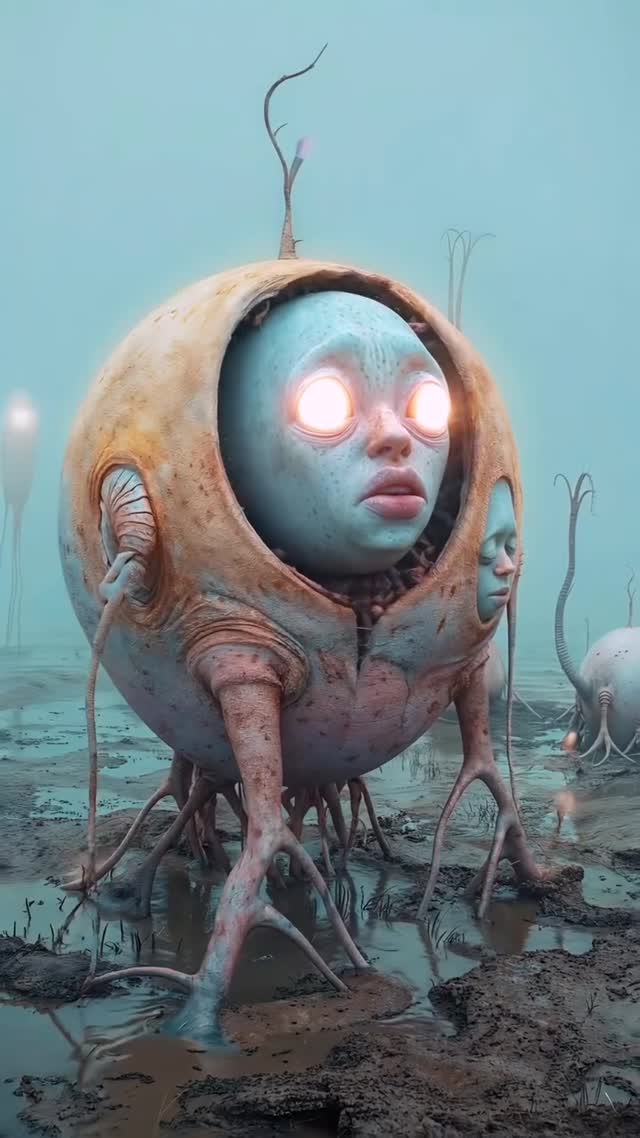 | 00:00–00:03 | A spherical pod with a face inside, root-like legs in mud. | Medium Shot, Static | Misty, teal/brown, glowing eyes. | The Hook: Immediate "What is this?" factor. |