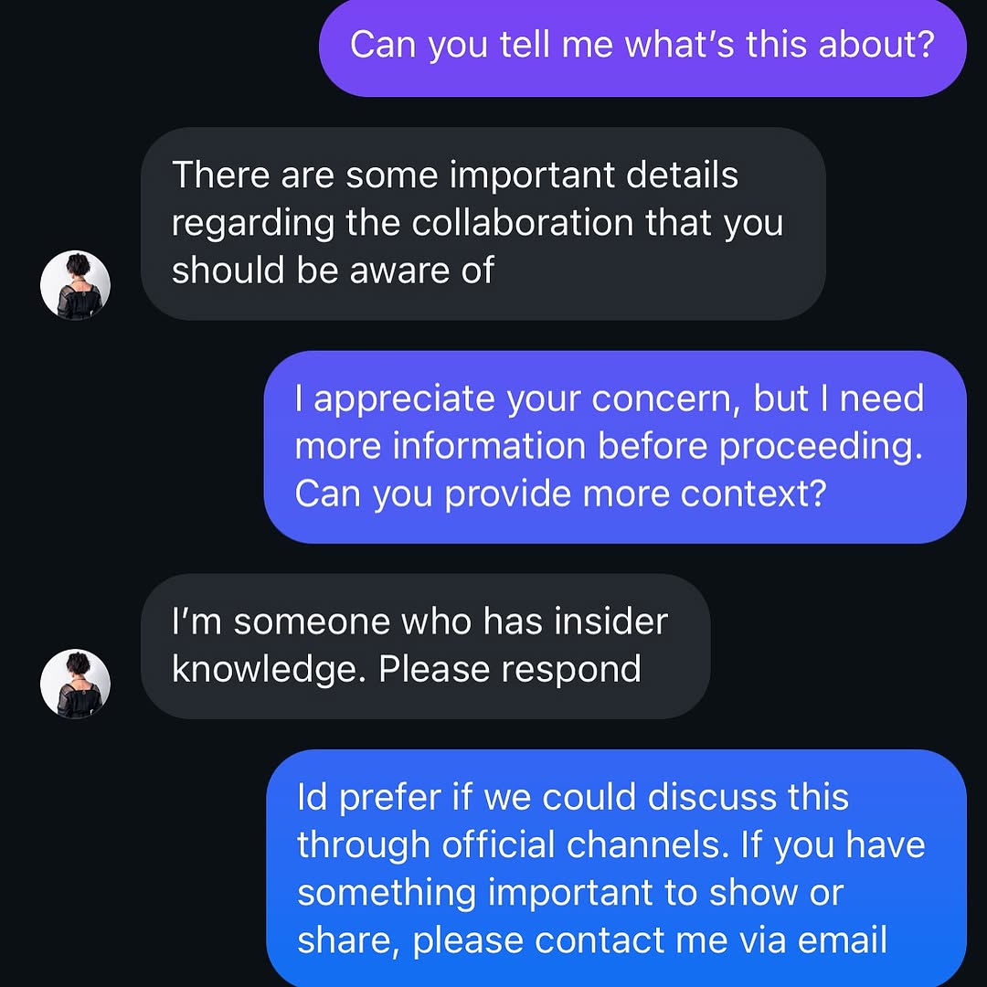 Direct: "Pause before you reply to unknown collaboration DMs."