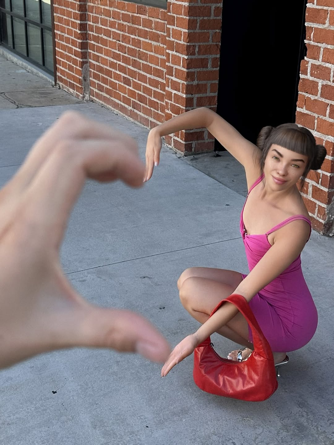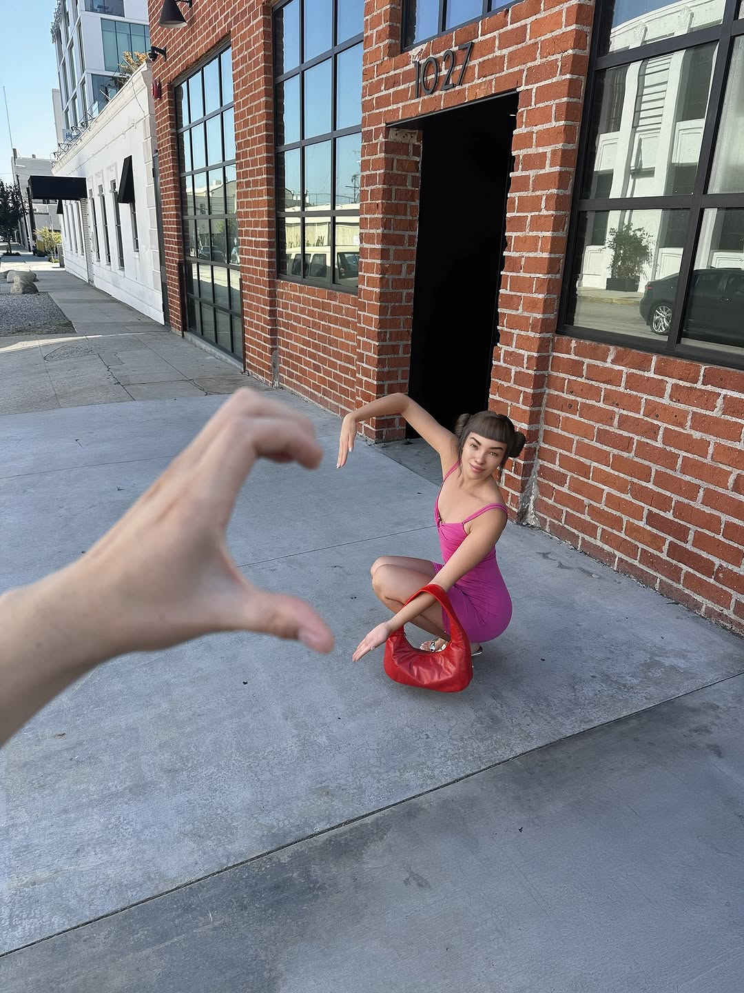 {street_scene} {profile_pose} {phone_screen_teaser} {single_accent_color}{beauty_space} {natural_skin_light} {collab_selfie_on_screen} {brand_color_accent}{travel_location} {candid_call_gesture} {destination_on_phone} {time_of_day_light}The image feels modern because it balances spontaneity with strict visual hierarchy. The camera sits close enough to make skin, fingers, and glasses tactile, but not so close that the scene loses context. The side-profile angle creates directionality, and the phone acts like a hinge between two narrative planes. Color discipline is especially strong: sky blue and off-white hold the frame together while pink appears only where the story needs emphasis. Light is plain daylight, which is exactly why it works. There is no theatrical setup competing with the subject’s action. Reflections on metal frames and phone glass quietly confirm realism. Even the background blur is calibrated: soft enough to remove clutter, sharp enough to read “real place, real moment.” The result is a creator-friendly aesthetic that looks achievable, not intimidating.