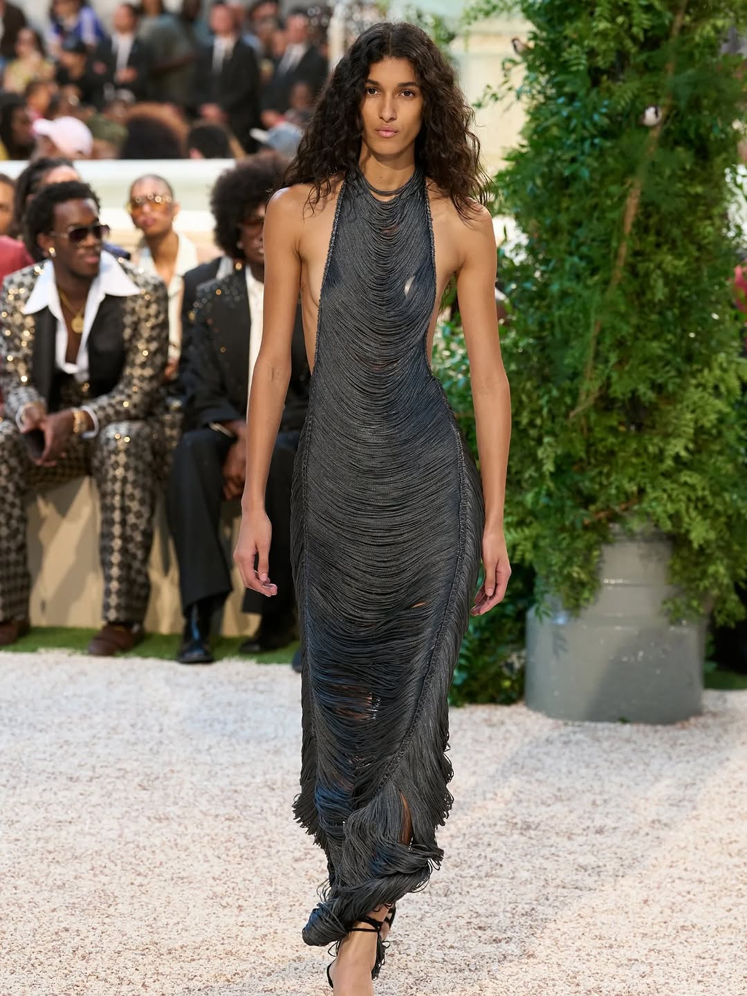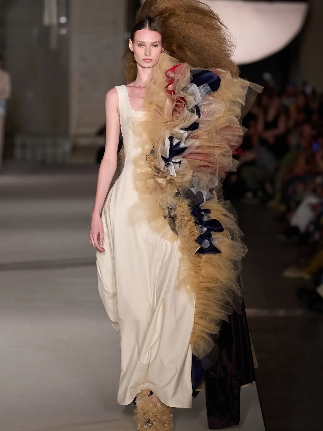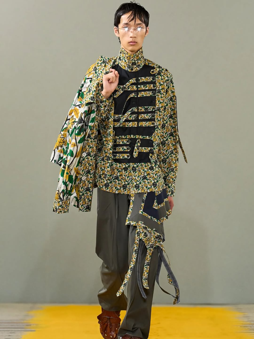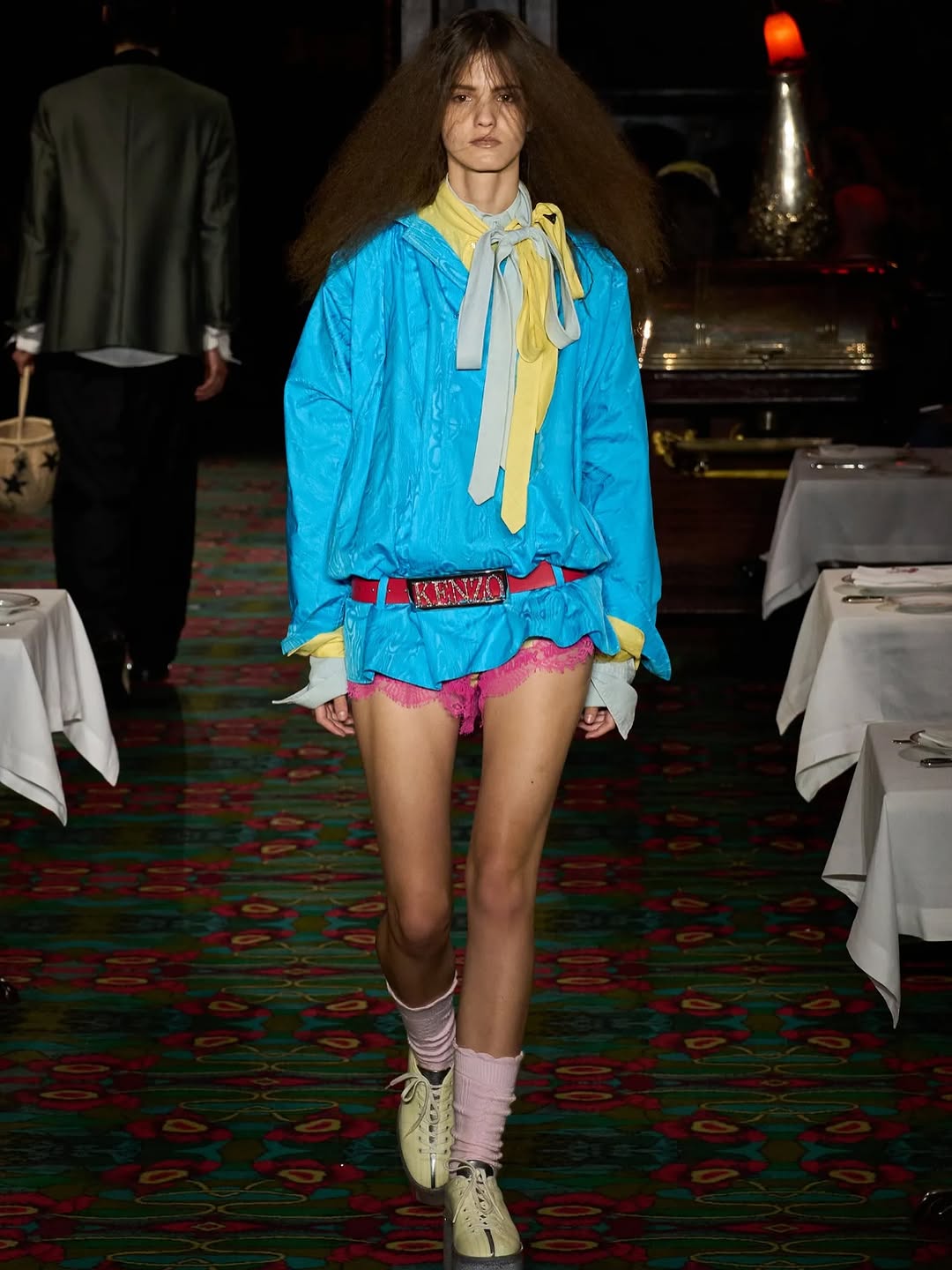 The image succeeds through controlled contrasts: color, texture, and posture. It is a strong runway visual because it documents both garment construction and stage attitude in one clean frame.
