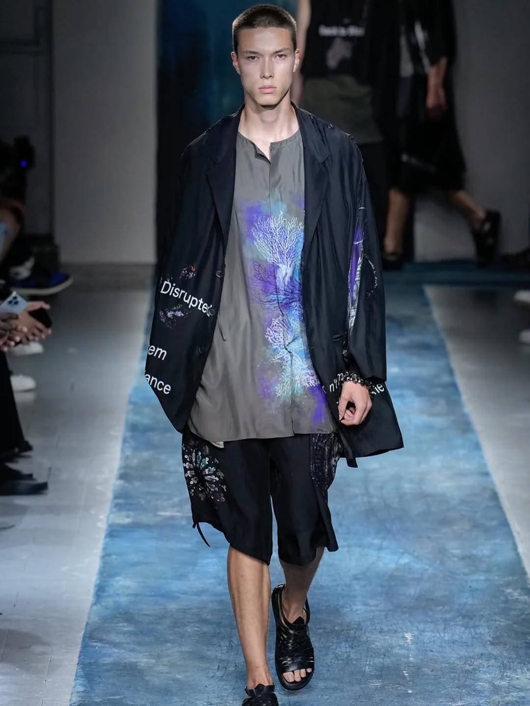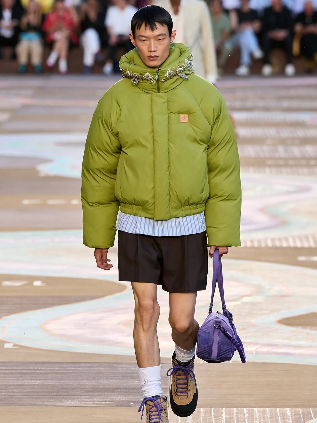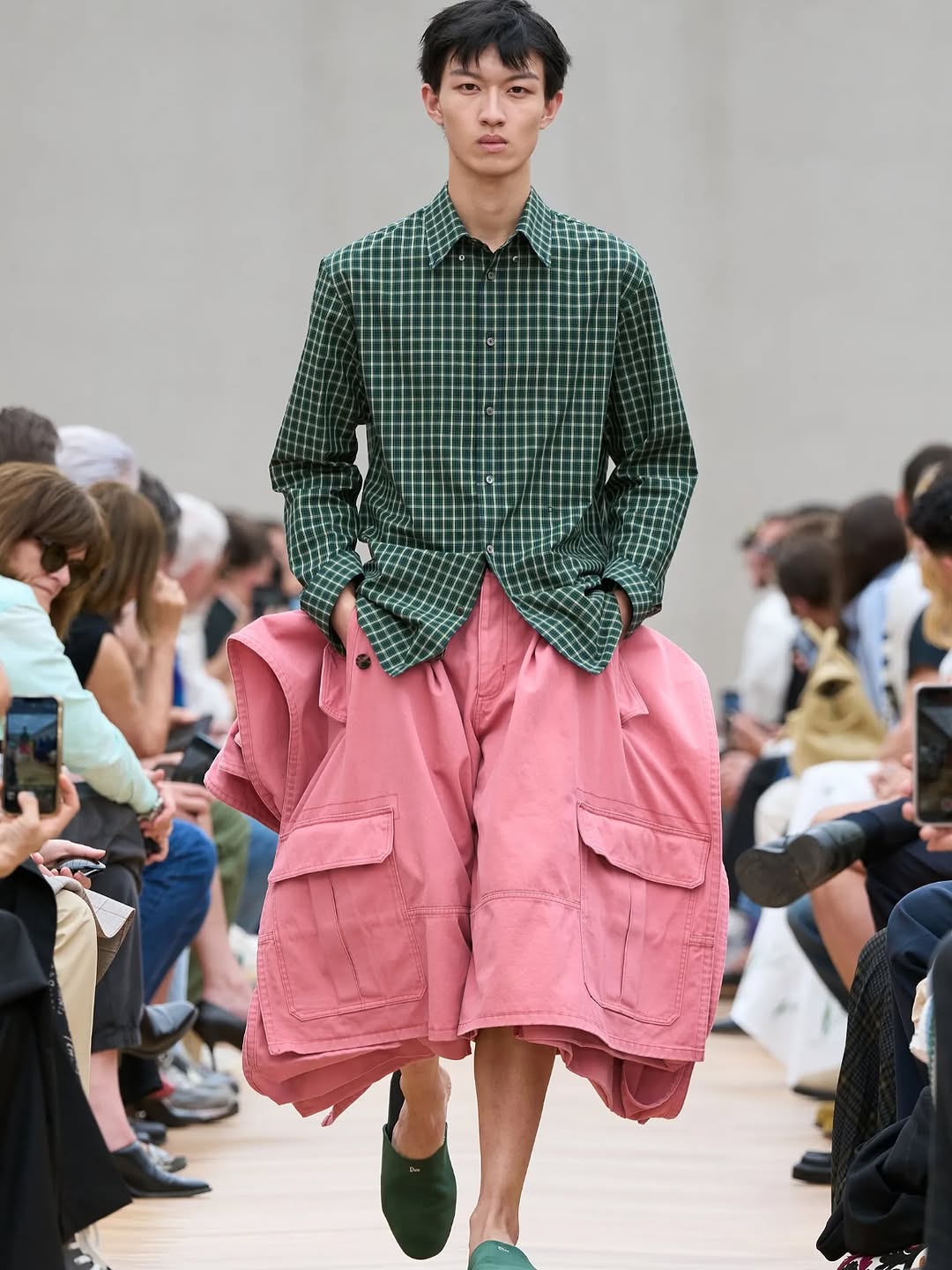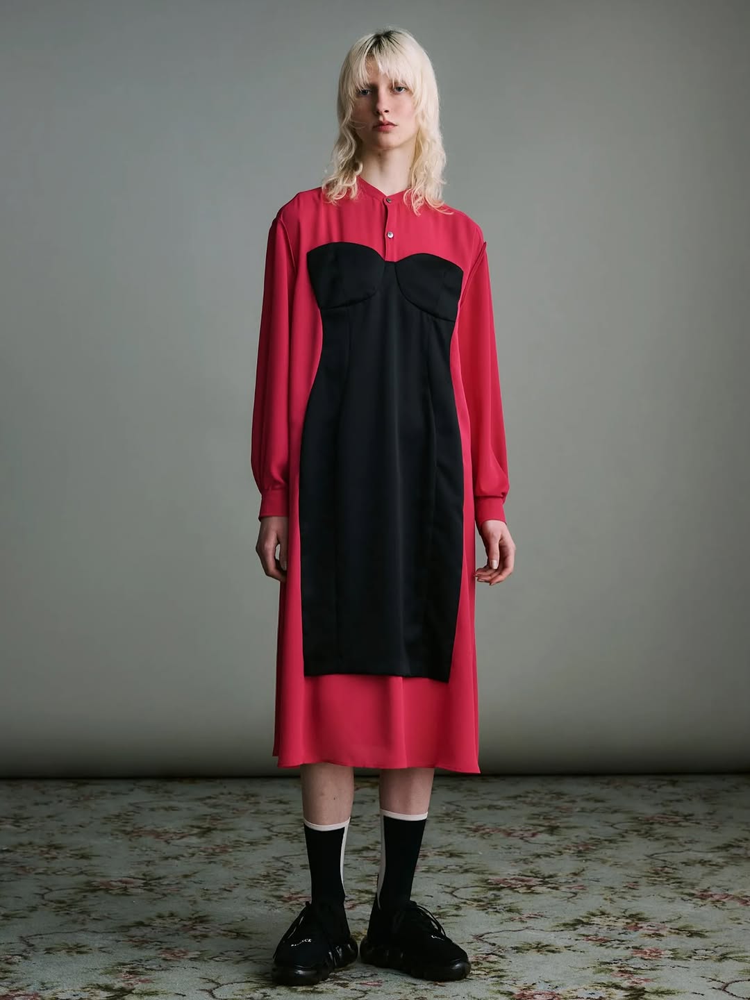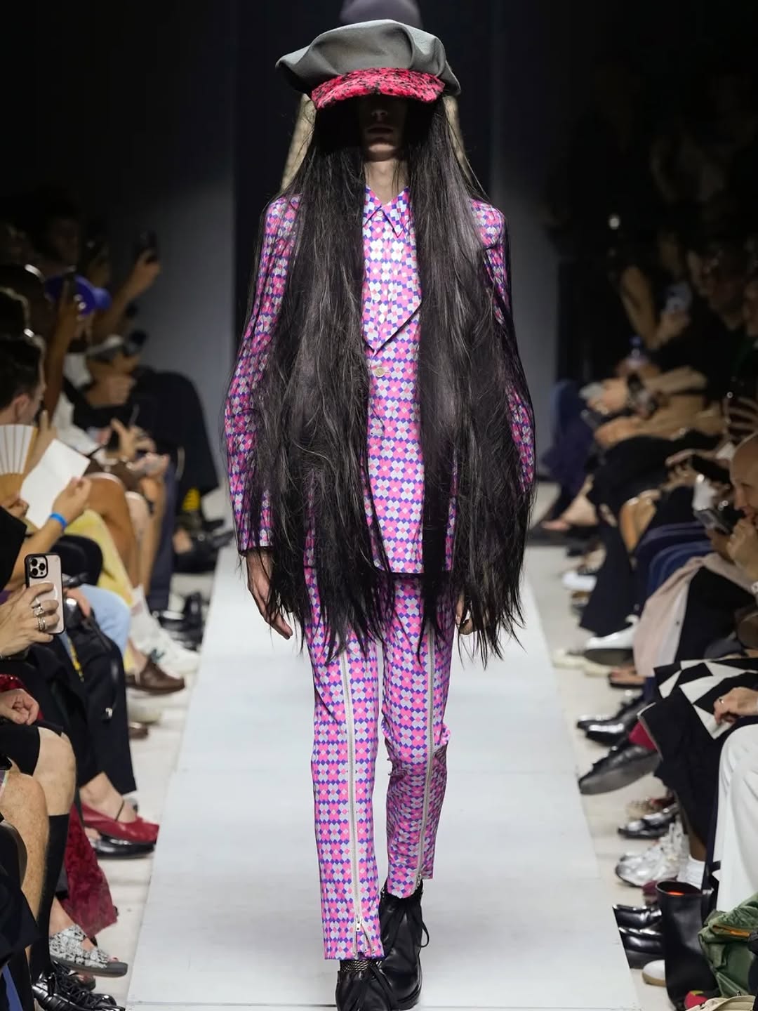 The image succeeds through controlled contrasts: color, texture, and posture. It is a strong runway visual because it documents both garment construction and stage attitude in one clean frame.