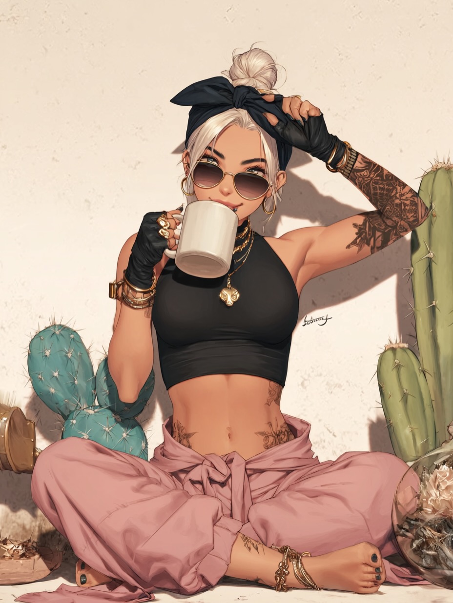 This image works because it turns a simple coffee-holding pose into a full identity statement. The mug matters, but only because everything else around it is so sharply controlled: the two-tone hair, the gold aviators, the tattoos, the black camisole, and the hard sunlight. Together they produce a portrait that feels both intimate and highly styled.