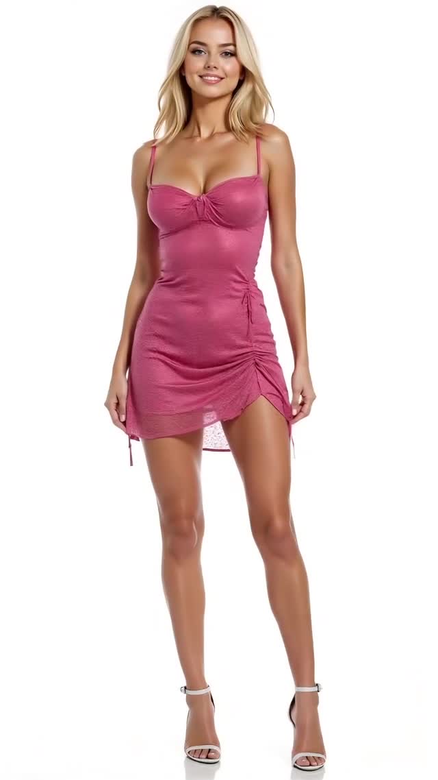 This short clip is a clean studio dress showcase reel that behaves like a hybrid between fashion lookbook and product try-on content. In about 10 seconds, one model rotates through front, side, and back views on a pure white background with high-key lighting, making garment fit, texture, and silhouette easy to inspect. There is no narrative setup, no props, and no distracting environment, which is exactly why this format works for conversion-focused content: every second is about the dress. The visual strategy is straightforward but effective for small creators and DTC fashion pages. First, start with a full-body front view to establish shape and color. Then transition into side and back angles for confidence and detail. Finally, return toward front to create a loopable finish. This specific execution highlights the pink ruched mini dress and metallic heels while preserving model identity consistency and camera stability. SEO-wise, this maps to long-tail intent like “pink mini dress try-on video,” “studio fashion reel prompt,” and “how to make ecommerce lookbook shorts.”