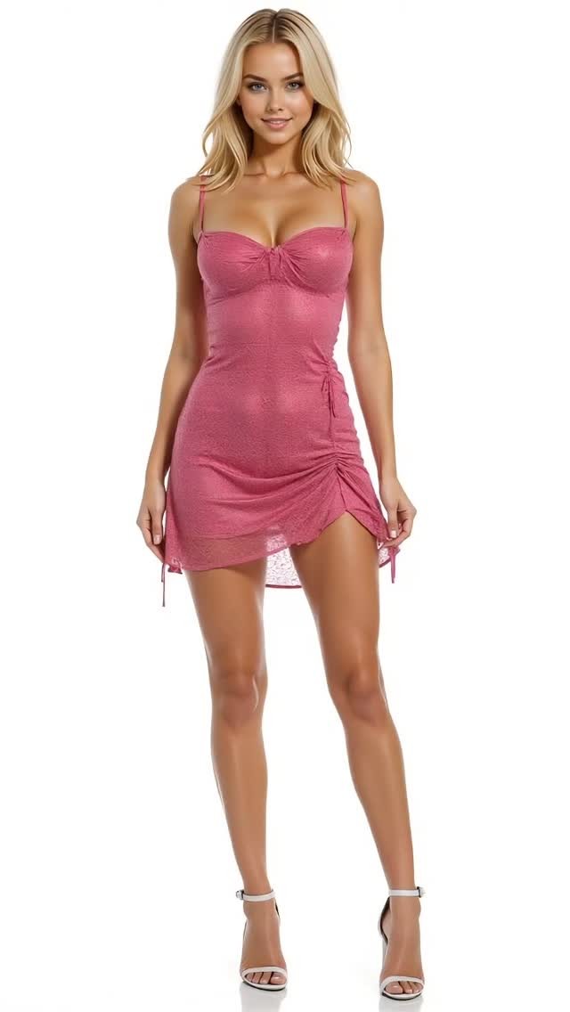 Pink ruched mini dress with side gather detail and silver strappy heels.