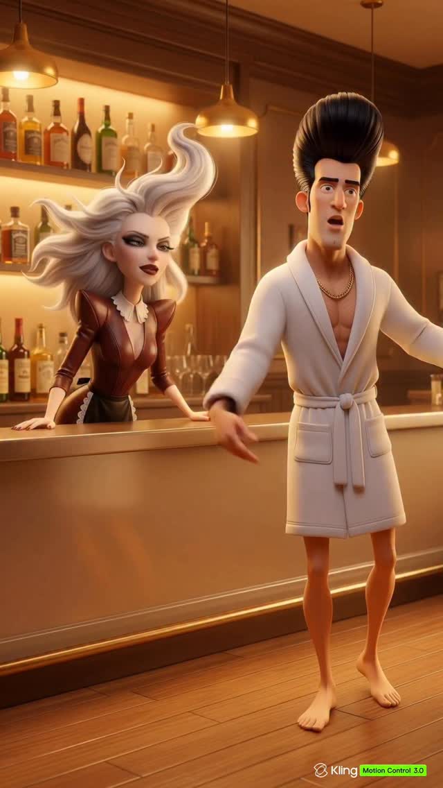 This short reel from myst_vault is a stylized 3D character vignette built around two instantly recognizable spy-cartoon archetypes: a Boris Badenov-inspired male lead and a Natasha Fatale-inspired female counterpart. The clip is not narrative-heavy. It is a personality performance piece staged inside a warmly lit bar, with Boris taking over the frame in a bathrobe while Natasha watches from behind the counter.