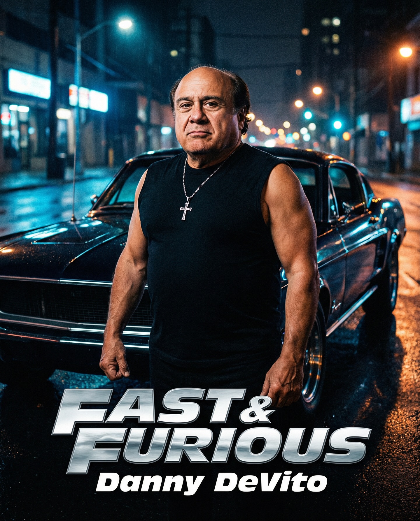The core move is simple: take Danny DeVito, place him inside the visual grammar of The Dark Knight, and commit fully to the mood. Instead of treating the concept like a meme, the image treats it like a serious studio poster. That decision is why it feels shareable rather than disposable.