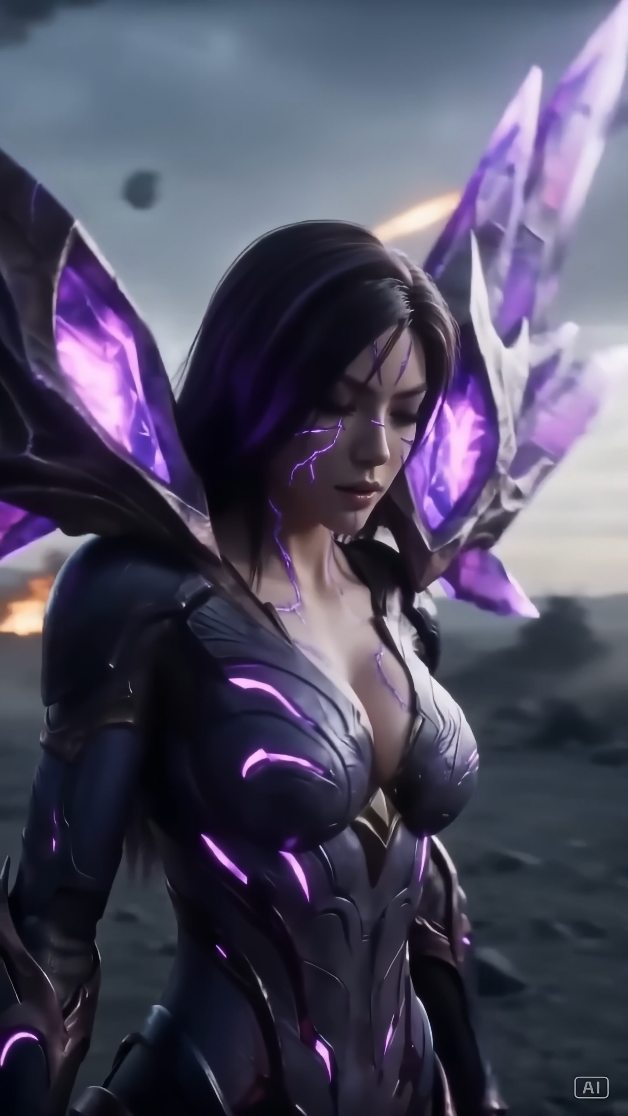 This reel is a clean transformation short built around a single iconic fantasy-sci-fi idea: a woman turning into a Queen of Blades-style warform. It starts with a vulnerable hooded figure and ends with a fully armored purple-winged alien queen hovering above a ruined battlefield.